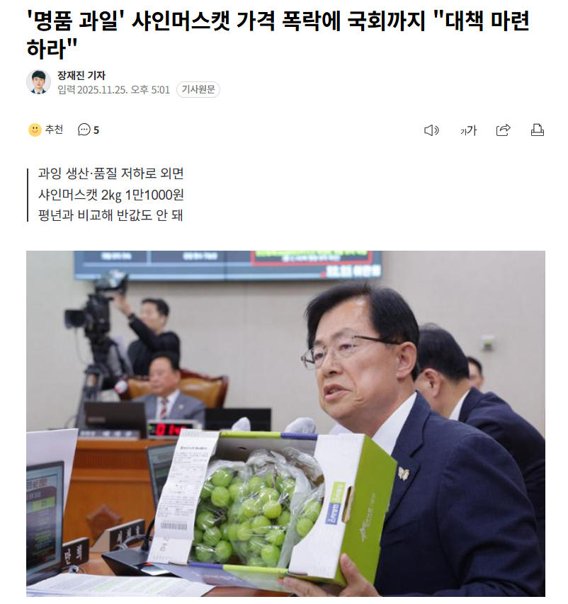 【“高档水果”阳光玫瑰葡萄价格暴跌,韩国国会要求"制定对策"】 曾一度被称为"高档水果"而备受欢迎的"阳光玫瑰"葡萄,其价格连年暴跌。这是由于生产过剩加之品质下降,导致消费者不再青睐。随着种植农户的损失扩大,韩国国会要求政府制定对策。据韩国农水产食品流通公社25日数据,以商品L级(品质等级高、果粒大的类型)为基准,当天2公斤阳光玫瑰葡萄的零售价格为11069韩元,比去年便宜了30%左右。与往年平均价格(26305韩元)相比,甚至不到一半。以当季的10月份为基准,阳光玫瑰葡萄在五年前的价格曾高达34828韩元,但此后连年下跌,今年已跌至13329韩元。阳光玫瑰葡萄价格下跌的原因之一,是它作为"高收益作物"备受追捧导致产量增加。据韩国农村经济研究院统计的"葡萄品种栽培面积比重",去年阳光玫瑰葡萄占比达到43.1%。其产量远超康拜尔早生(29.3%)或巨峰葡萄类(17.5%)等其他品种。而在五年前,阳光玫瑰葡萄的栽培比重仅为22.1%。品质下降也是问题所在。阳光玫瑰葡萄甜度达到理想水平的单串重量约为650克左右,但部分农户为了将葡萄卖得更贵,开始栽培比这更大的果串。为了最大化收益,不少农户将未完全成熟的葡萄提前出货。随着这种情况反复出现,阳光玫瑰葡萄的甜味日益下降。阳光玫瑰葡萄的"没落"在国会也被作为紧急议题进行讨论。在上月28日国会农林畜产食品海洋水产委员会举行的国政监察中,国民力量党议员李万熙拿出市面上销售的阳光玫瑰葡萄礼盒,向农林畜产食品部部长宋美玲施压,称"(对于价格下跌问题)无人关心",并要求"必须制定供需调节或价格稳定措施"。农海水委在本月13日审查明年预算案的过程中,也提出了一项附带意见,要求"政府应制定针对阳光玫瑰葡萄价格下跌的对策"。政府计划首先引导农户改善品质。农林畜产食品部相关人士表示:"政府正推进通过要求农户进行合同种植来稳定价格,并管理阳光玫瑰葡萄品质的方案","目前正在了解农户的需求"。