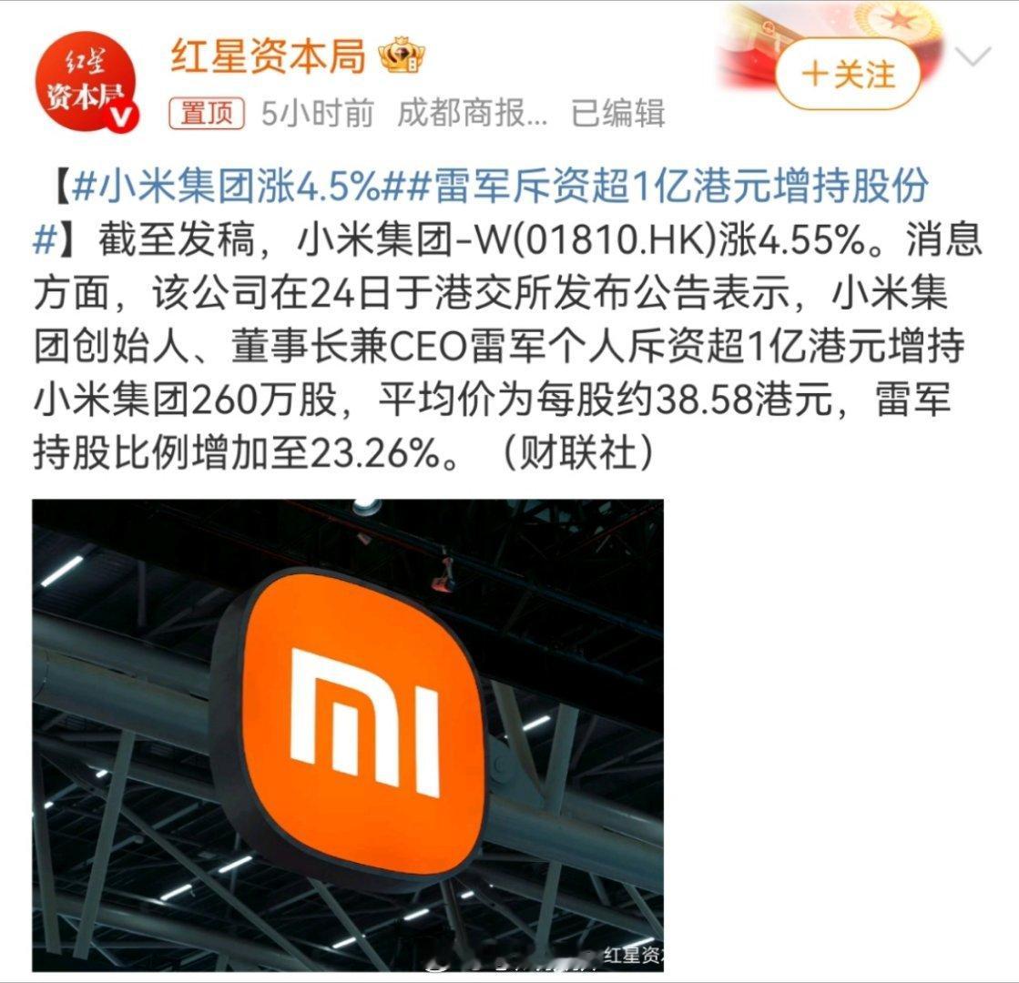 雷军昨天增持,今天就涨了4.5%。看得出来市场长期来说,对小米还是很有信心的。看得我好馋,做车评做自媒体,不如去炒股赚得多
