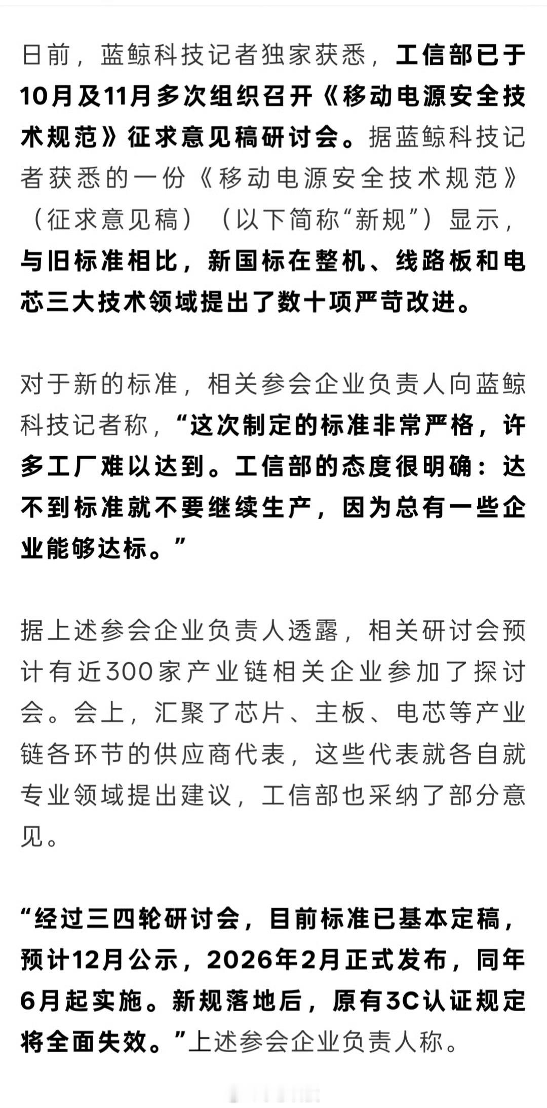 充电宝的新国标要求将发布,3C认证标准将全面失效,新标准要求充电宝得标使用寿命和代工厂,还得有屏幕或 APP 显示电池健康,电芯安全测试也更苛刻,不准用二手电芯。不过大家别慌,26年实施,手里有 3C 认证的充电宝还能继续用,也能带上飞机。过渡期买的话,2026 年 6 月前可以看看降价的旧标产品,但要避开劣质货,之后就认准新国标标识就行。新标准下充电宝价格可能涨30%,但能用更久,算下来更划算。我觉得这政策挺好的,之前充电宝自燃事故不少,新国标能倒逼行业重视安全,对咱们消费者来说更放心,毕竟安全比便宜更重要不过国产新机的电池也快突破10000mah了,安卓用户大多都不需要充电宝了,充电宝的用户市场更多可能是iPhone用户了,也不在乎新标准涨价