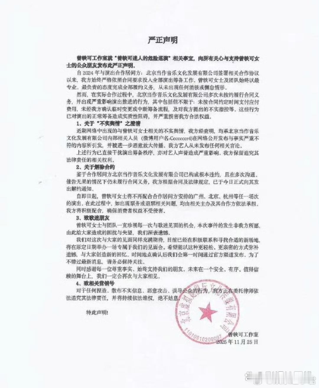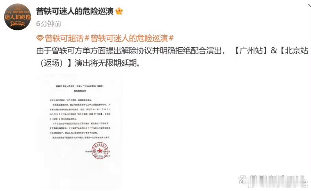 25日,巡演方发公告称曾轶可广州北京站演出将无限期延期。曾轶可工作室也发声明回应,曾轶可始终严格依照合同要求投入全部演出筹备工作,相关合作公司多次未按约履行合同义务,曾轶可方已向合作方发出解约通知;且曾轶可从未发布任何网传言论,对于不实信息将依法追究法律责任。