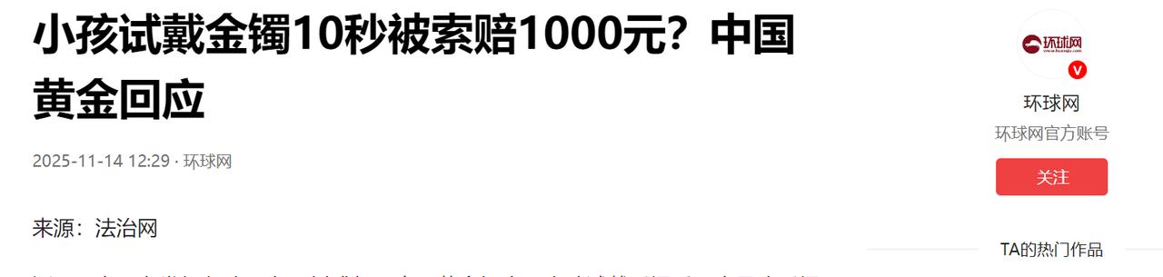 妈妈给孩子试戴金手镯,戴了不到10秒拿下来,遭店员索赔1000元!店员:手镯被你戴变形了!民警怒怼店员:“太离谱,想钱想疯了吗?这样讹人!”网友:这个民警给力,没有和稀泥!没有报案打半折! 这事发生在 11 月 12 日,一位宝妈带着孩子逛商场,走进了中国黄金的门店,看着柜台里的黄金手镯,宝妈想着给孩子试试款式,就请店员拿了一只出来。 镯子尺寸偏大套在孩子手腕上松松垮垮的,宝妈怕不合适,前后也就戴了不到 10 秒,就赶紧取了下来准备还给店员,可谁能想到就是这短短 10 秒钟,麻烦突然找上门来。 店员接过手镯突然脸色一变,指着镯子说 “你给戴变形了”,张口就要宝妈赔偿 1000 元,宝妈当场就懵了,自己明明没用力,就轻轻戴了一下又取下怎么可能变形?她反复解释可店员根本不听,一口咬定是孩子试戴造成的损伤,还拦在门口不让她们母子离开,非要赔钱才能走。 好好的逛街变成了 “被索赔”,还被强行阻拦,宝妈又急又气没办法只能选择报警,民警赶到现场后,先查看了那只被说 “变形” 的手镯,发现所谓的 “损伤” 微乎其微,就算真要修复,成本也低得可怜,再听了宝妈和店员各自的说法,民警当场就怒了,直接怼了店员一句:“太离谱,想钱想疯了吗?这样讹人!” 这句话真是说到了大家心坎里,也让宝妈悬着的心落了地,要知道黄金饰品本身质地偏软,试戴是再正常不过的消费环节,哪有戴 10 秒就索赔 1000 元的道理? 如果真的娇气到碰一下就坏,商家要么该提前明确告知风险,要么就不该拿出来让顾客试戴,怎么能事后突然翻脸,把责任全推给消费者? 其实这种 “试戴索赔” 的糟心事,也不是第一次发生了,今年 6 月四川成都就有位顾客,在店员全程陪同下试戴黄金项链,结果被指责弄坏了卡扣,被要求赔偿 1800 元。 虽然后来监管部门介入,认定商家拿不出确凿证据责令停止索赔,但这种把试戴变成 “踩雷” 的操作,在黄金行业里似乎越来越常见。 为啥店员会变得这么 “敏感” 甚至激进?说到底还是利益在作祟,从去年年底开始,国际金价一路上涨,今年 4 月更是涨到了每克 600 元以上,金价贵了买的人少了,门店成交难,不少商家就调整了店员的薪酬结构,提成直接和成交额挂钩。 业绩压力一大,有些店员就动了歪心思,把试戴时的一点点小瑕疵,当成了转嫁风险、弥补业绩的 “机会”,更让人无语的是,很多门店试戴前根本不提醒消费者 “黄金质地软,可能容易变形”,也不张贴任何试戴须知,等出了点小问题就立刻翻脸要钱。 根据消协去年 7 月的抽查,全国 60 家黄金门店里,主动做试戴风险提示的还不到三成,这种 “先不设防,事后伏击” 的套路,就是利用消费者不懂专业鉴定、不想惹麻烦的心理,变相 “讹钱”。 也正因为这样,黄金珠宝行业的投诉量最近暴增,去年一年的投诉量就比之前涨了 136.28%,涉案金额快一个亿了。想想看,多少消费者和这位宝妈一样,本来是带着信任进店,结果却遭遇这种糟心事,没地方说理,只能吃哑巴亏。 好在这次有民警撑腰,没让商家的套路得逞,网友们看到这事儿后,都纷纷为民警点赞:“这才是为民做主,没有和稀泥让消费者让步,也没有搞什么‘报案打半折’的荒唐操作”“店员真是想钱想疯了,10 秒索赔 1000,这和敲诈有啥区别?” 其实大家气愤的不只是这 1000 元的索赔,更是商家对消费者信任的践踏,黄金再贵重也重不过人心,生意再难做也不能靠 “讹人” 赚钱,消费者敢伸手试戴,是相信品牌的信誉,可如果连这份基本的信任都要被利用,那柜台里的黄金再闪耀,也照不亮商家难看的吃相。 (信息来源:环球网——小孩试戴金镯10秒被索赔1000元?中国黄金回应)