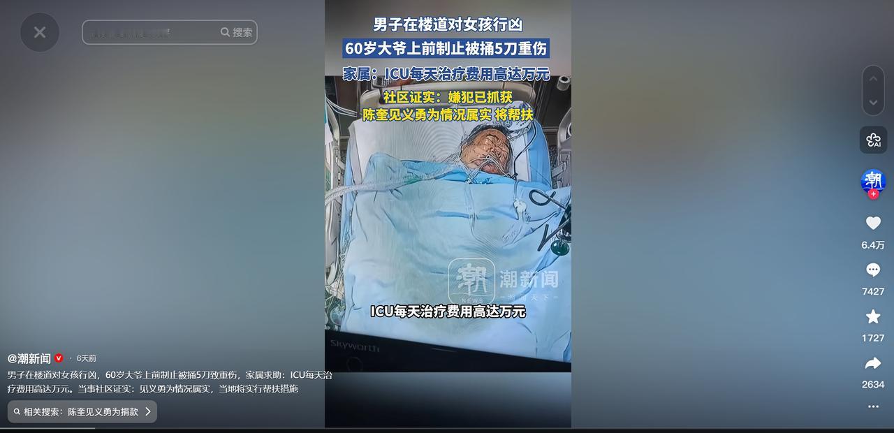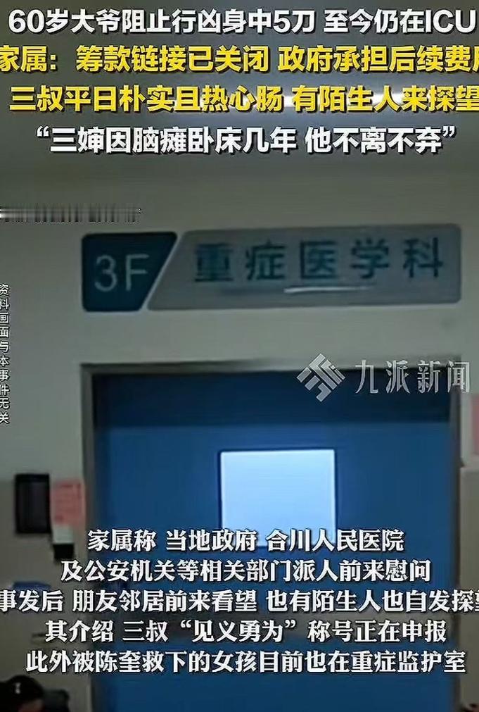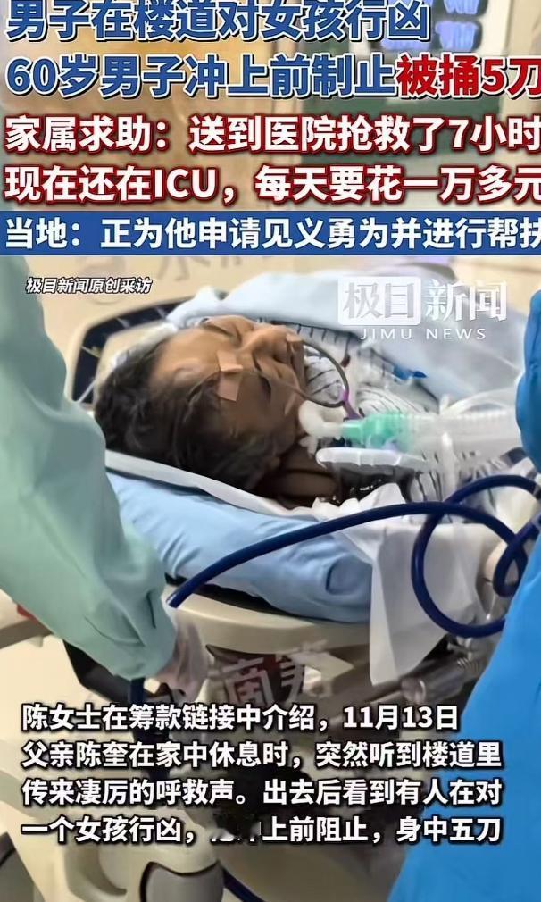 “不能让好人寒心!”重庆,60岁大爷听到楼道里有女孩喊救命,立马出家里跑出去,看到一个男子正拿着一把刀对女孩行凶!大爷见状,立马冲上去阻止,结果被连捅5刀,至今还在ICU里躺着!而且每天治疗费超1万,家里实在支付不起了! 这位大爷名叫陈奎家住重庆合川区,今年 60 岁是个再普通不过的老人,他的日子过得不算轻松,妻子因为脑瘫已经卧床好几年了,家里的大小事全靠他打理,他就是这个家的顶梁柱。 11 月 13 号那天,原本和往常没什么两样,陈大爷正坐在家里看电视,想着等会儿给妻子倒杯水,或者跟女儿通个电话聊聊家常,可一声凄厉的 “救命”,彻底打破了这份安稳。 那声呼救穿透家门,听得人心里发紧,带着极度的惊恐,任谁听了都没法坐视不理,陈大爷没有丝毫犹豫,立马丢下手里的遥控器,起身就冲进了昏暗的楼道里,眼前的场景让他心头一紧,一名凶神恶煞的男子正挥舞着利刃,刀尖直直对着邻居家的女孩,女孩毫无还手之力,只能无助地承受着威胁。 这是一场完全不对等的对峙,男子手里有刀而陈大爷赤手空拳,可他根本没顾上想自己会不会有危险,本能地就挡在了女孩和那把刀之间,还大声喝止男子的行为。 可失控的凶徒根本没停下,反而把怒火和杀意都转向了这个突然冲出来的老人,疯狂的五刀接连落在陈大爷身上,鲜血瞬间染透了他的衣衫。 等凶手落荒而逃后,楼道里只剩下满地血腥,陈大爷和被护住的女孩都倒在了地上,当时陈大爷的意识已经开始模糊,剧痛让他几乎撑不住,但他凭着最后一点力气摸出手机打给了女儿。 后来据送医路上的护士回忆,这位浑身是血的老人,嘴里念叨的不是自己有多疼,而是一直牵挂着那个女孩,担心她有没有事。 随后两人被紧急送往合川区人民医院抢救,直到现在陈大爷和那个女孩还在重症监护室里,和死神拔河,警方很快就抓获了行凶的男子,当地社区也第一时间着手为陈大爷申报 “见义勇为” 的荣誉,这些回应让大家觉得正义没有缺席,可陈大爷一家面临的困境,却让人喘不过气。 这个家本来就靠着陈大爷撑着,现在顶梁柱倒了卧床的妻子没人照顾,更让人绝望的是高昂的治疗费。每天超过 1 万元的开销,像一座冰冷的大山,压得陈大爷的女儿喘不过气,从 11 月 17 号开始,实在没办法的家属,只能面向社会发起筹款,希望能凑够治疗费保住陈大爷的命。 想想看陈大爷冲出去的那一刻,根本没来得及想家里瘫痪的妻子该怎么办,没来得及权衡自己会不会出事,只是凭着一腔善意和勇气,就选择了保护一个陌生的女孩。 他用自己的身体挡住了利刃,换回了女孩的生命,可这样的英雄,却要让自己的家庭面临倾家荡产的风险,这实在太让人难受了。 网友们知道这件事后,都纷纷为陈大爷点赞,更心疼他的遭遇,留言区里全是 “不能让好人寒心” 的呼声,大家一边谴责行凶的男子,一边主动为陈大爷捐款,哪怕是几十块、几百块,都想着能帮这个家分担一点。 有人说:“大爷冒着生命危险救人,我们不能让他流血又流泪”“好人就该有好报,希望他能早日康复,治疗费的事大家一起想办法”。 其实我们常说 “好人难做”,不是因为大家不想善良,而是有时候善良的成本实在太高了,陈大爷只是个普通老人,他没有什么惊天动地的本事,却在关键时刻挺身而出,这份勇气和善意,比什么都珍贵,英雄身上的伤口是勋章,但勋章也需要药费去愈合,不能让英雄为了保护别人,最后让自己的家陷入绝境。 现在越来越多的人加入到帮助陈大爷的行列中,一点点善款汇聚起来,就是一股强大的力量,这不仅是在救陈大爷的命,更是在守护这个社会最珍贵的良心,希望陈大爷能早日脱离危险,顺利康复,也希望相关部门能多给这个家庭一些帮助,让他们不用再为治疗费日夜焦虑。 (信息来源:潮新闻)