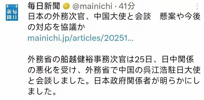 日本态度急转弯?根据日本《每日新闻》11月25日的报道,日本外务省次官船越健裕25日在外务省会见了中国驻日本的大使吴江浩。由于这件事刚刚发生不久,日本方面还没公布会见的具体信息,中国驻日本大使馆网站也没有更新相关内容,但可以确定的是,这是日本态度转变的信号之一。 前几天还说“无意撤回发言”的高市早苗,前脚刚和特朗普通过电话,后脚东京就安排这场会面。时间卡得这么准,不可能是巧合。看起来,日本这艘船,确实开始调头了。 但问题是,这是一次彻底的转向,还只是风大了,先把帆收一收? 先看压力从哪来。中国最近的动作,看似温和,实则步步踩在七寸上。11月14日那条“提醒公民暂勿前往日本”的安全通告,表面是安全考量,实际影响却不小。过去三年,日本旅游业复苏全靠海外游客撑着,而中国游客人均消费是欧美游客的1.8倍。2024年第三季度,中国赴日游客刚恢复到疫情前六成,免税店、药妆店、高端餐饮就明显回暖。这条提醒一出,机票预订量当天就掉了三成,乐敦制药股价应声跌了9%。这不是宣战,但比宣战更让企业坐不住。 再看美国那边。特朗普25日上午与高市早苗通话,内容未公开,但时间点耐人寻味。就在一周前,他在采访中明确表示“美国不会为第三方卷入冲突”,直接把“台海有事就是日本有事”这句话给否了。日本本想借势刷存在感,结果盟友先划清界限。这种“被抛弃感”,比中国的反制更让东京心里发毛。 所以,日本现在急着见面,更像是在找台阶下。 可这个台阶,不是一抬脚就能下去的。 第一,特朗普的态度向来反复。他今天说“别惹事”,明天可能又喊“必须强硬”。他对高市早苗的“劝导”,更像是在中美需要对话窗口时,暂时压一压火药桶。一旦美国国内政治风向变,他随时可能重新鼓动盟友搅局。日本吃过亏,不敢真把身家性命押在这上面。 第二,高市早苗的政治人设是个问题。她靠右翼言论上位,支持者认的就是“强硬对华”这张牌。如果今天见了中国大使,明天就公开撤回言论,国内舆论立马会说她“屈服于压力”“丢了国家尊严”。这种政治代价,没人扛得起。她必须先放风、再试探、让媒体慢慢造势,最后再“顺应民意”地调整立场。这不是虚伪,是政治现实。 第三,中日之间的沟通渠道,不是开个会就能立刻接上的。高层互访停了,地方交流撤了,青年对话也搁置了。这些不是靠一次外务省会谈就能重启的。接下来大概率会有一系列低级别接触,比如经贸磋商、领事事务协调、智库对话,一步步试水。如果哪一环出问题,整个进程又得回到原点。 所以,别把这次会见当成“大反转”。它更像是一次“探风”。 日本在试探中国有没有给台阶,中国也在看日本有没有真诚意。双方都在等对方先动一步,又都不想显得太急切。 但有一点是清楚的:谁的经济更扛得住冷战,谁的外交就更有底气。中国有完整的产业链,有庞大的内需市场,有独立的外交政策。你可以施压,但无法胁迫;你可以挑衅,但不会动摇。 而日本,资源靠进口,市场靠出口,安全靠同盟。这种结构性依赖,决定了它永远无法真正“硬到底”。 这次他们主动开门,不是因为想和解,而是算清了账:跟中国搞对抗,企业受不了,老百姓不答应,连经济都撑不住。 一个国家的外交,最终拼的不是口号,而是能不能承受住说“不”的代价。 日本还在权衡。中国早已看清。 各位读者你们怎么看?欢迎在评论区讨论。