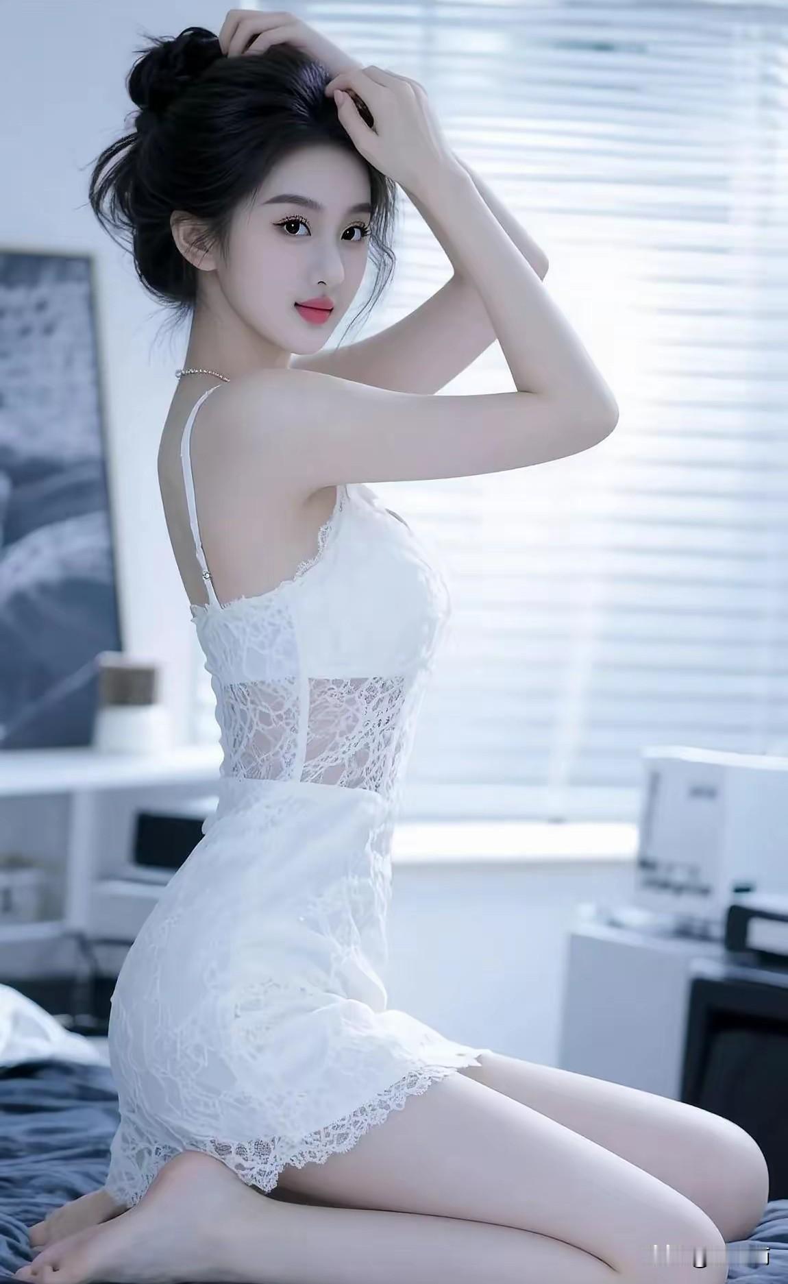 温柔甜美的少女, 穿着优雅的浅蓝色蕾丝连衣裙, 坐在柔软的床上, 散发着迷人的魅