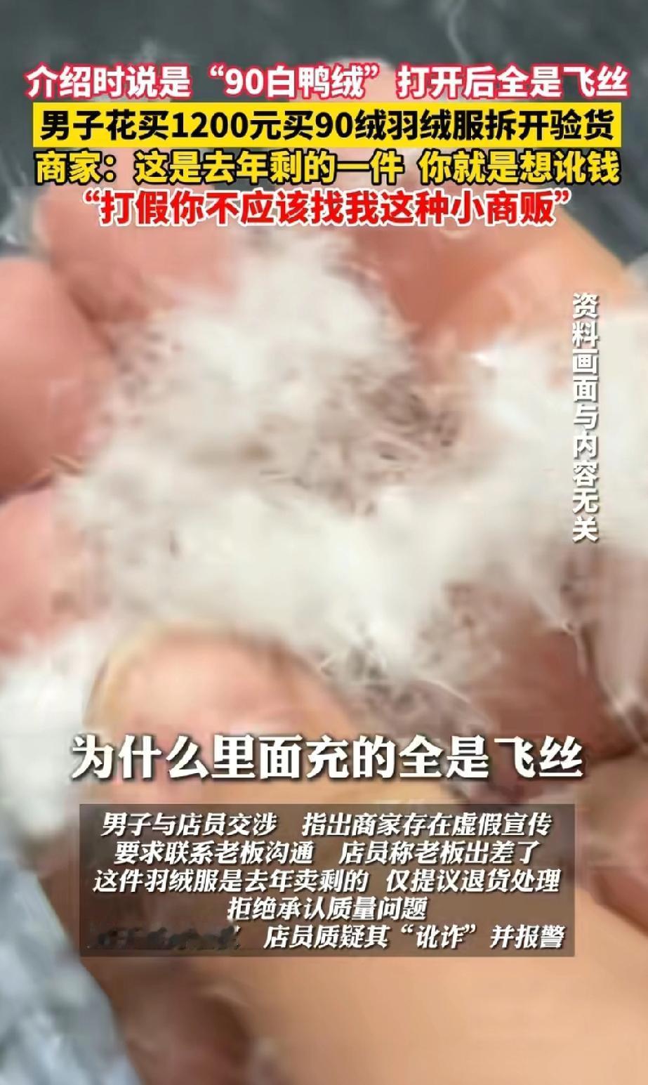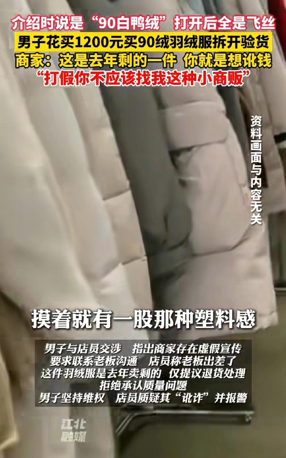 安徽亳州,男子花3000多元买羽绒服,他剪开2件衣服,发现是塑料飞丝不是羽绒。男子称店家存在虚假宣传,叫老板给个说法,店员却说老板出差,还不承认质量问题,表示这衣服是去年卖剩的,只接受退货,男子气得要维权,谁知,店员却表示男子是“讹诈”,直接报警。警察却表示,此事不归他们管。 寒潮来袭,一男子为抵御严寒,看到一家服饰店打着宣传“90白鸭绒”的羽绒服,单价高达1200元一件。 他心想这价格,虽然有些贵,那质量肯定不错。 毕竟好货不便宜,便宜没好货。 他咬了咬牙,花费3000多元购置了几件羽绒服。 本以为高价能换来优质保暖体验,谁知他想的太美了。 他发现这两件羽绒服的保暖效果远不如宣传中所说,甚至比普通棉衣还要逊色,而且衣物表面还出现了填充物飞丝的情况。 既然有了怀疑,那就剪开看看吧,否则自己吃亏。 男子决定看看里面的真材实料,他来剪刀,小心翼翼地剪开了两件羽绒服的边角。 这一剪让他大为震惊:衣服内里的填充物根本不是商家宣称的羽绒,而是一团团类似线头的丝状物质,触感发硬,毫无羽绒应有的蓬松感。 男子也是行家,他一眼看出这类物质正是业内俗称的“塑料飞丝”。 一种价格低廉、保暖性极差的劣质填充物,与真正呈蒲公英状的羽绒绒朵有着本质区别 。 男子拿着剪开的羽绒服质疑店家,指出产品与宣传严重不符,属于虚假宣传,要求老板给出合理说法并赔偿损失。 可店员却称老板出差了,不仅拒不承认质量问题,还辩称这两件是去年卖剩的尾货。 言语间毫无歉意,只愿意为男子办理退货退款,拒绝承担额外赔偿责任。 店家的敷衍态度让男子十分气愤,他明确表示要通过合法途径维权到底。 没想到店员态度突然强硬起来,反过来指责男子是故意找茬“讹诈”店铺,随后直接拨打了报警电话,想让警方来“处置”男子。 民警赶到现场后,经过详细了解情况、查看相关证据,明确告知双方:此事不属于公安机关管辖范围。 原来,这起纠纷本质是消费纠纷,核心是产品质量与虚假宣传问题,属于民事纠纷范畴,而非刑事犯罪或治安案件,不符合警方立案的法定条件。 民警建议男子保留好购物凭证、衣物填充物样本等关键证据,通过拨打12315投诉热线、向市场监管部门举报或提起民事诉讼等合法途径维权,维护自身的消费权益。 目前,男子已着手收集相关证据,准备向市场监管部门反映情况,坚决向商家讨要说法。 《消费者权益保护法》第20条规定:经营者向消费者提供商品信息,应当真实、全面,不得作虚假或引人误解的宣传。 店家宣称羽绒服为“90白鸭绒”,实际填充“塑料飞丝”,属于典型虚假宣传;消费者因虚假宣传遭受损害,有权要求经营者赔偿,而非仅接受退货退款。 《产品质量法》第5条规定:禁止在销售产品中“以假充真、以次充好”。 商家用廉价劣质的塑料飞丝冒充优质羽绒,已违反该禁令。同时,销售不合格产品冒充合格产品,需承担相应法律责任。 《消费者权益保护法》第11条规定:消费者购买商品遭受财产损害,享有依法获得赔偿的权利。可要求商家退货退款,并承担额外赔偿责任。 《产品质量法》第18条规定:县级以上市场监管部门可对涉嫌质量问题的产品进行查处,包括查封扣押相关产品,男子可向市场监管部门举报,要求对商家违法行为予以处罚,如没收违法所得、处以货值金额50%以上三倍以下罚款等。 对此你怎么看?