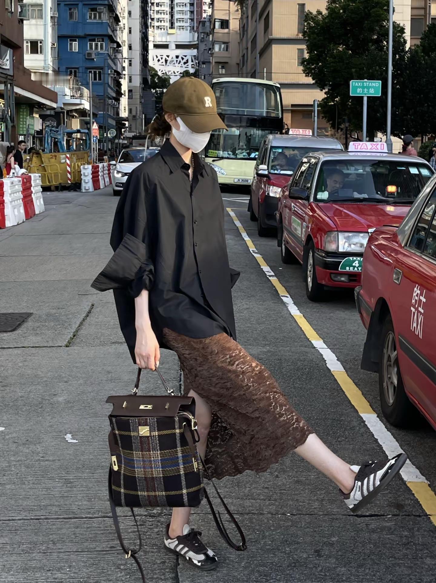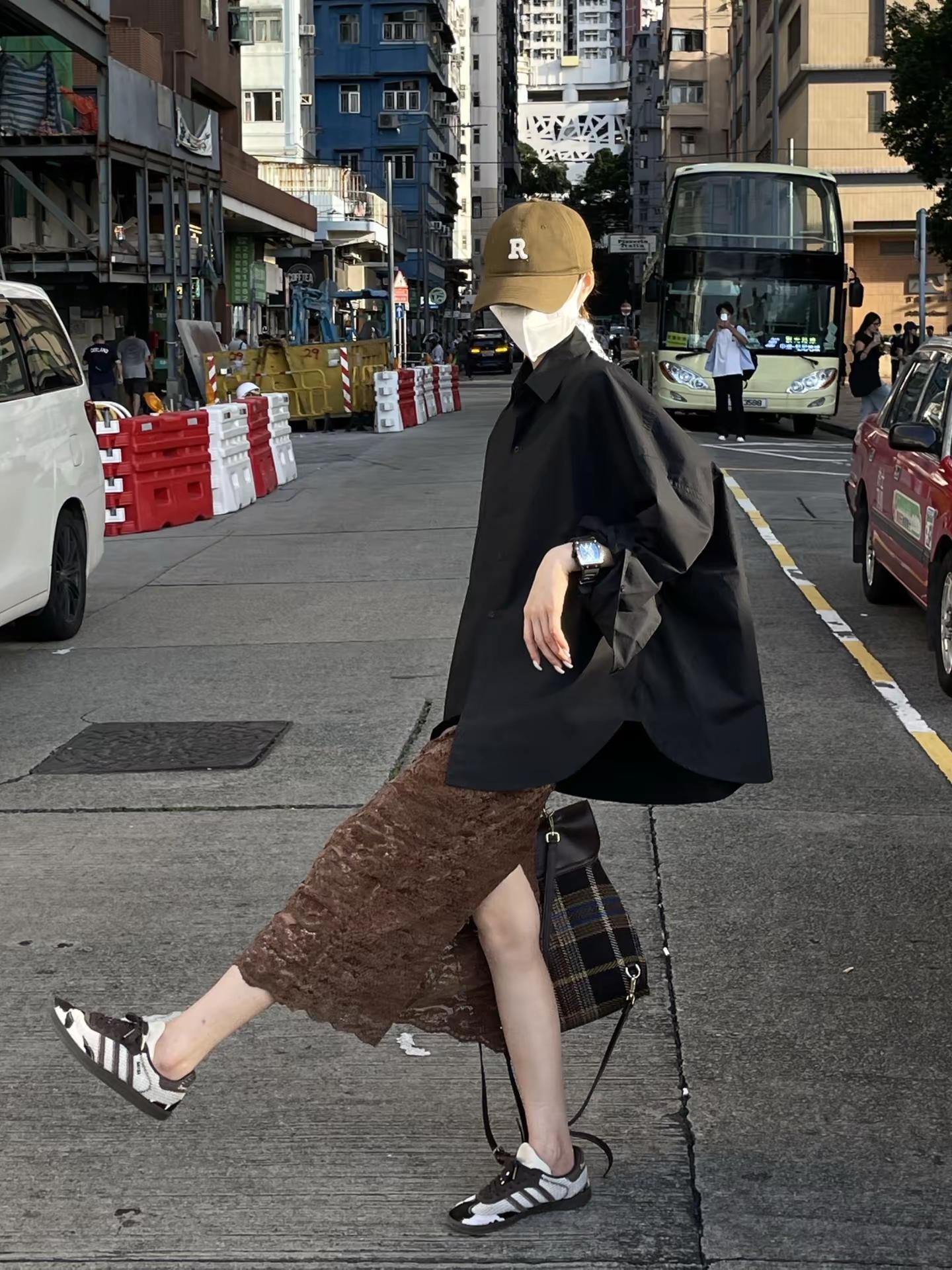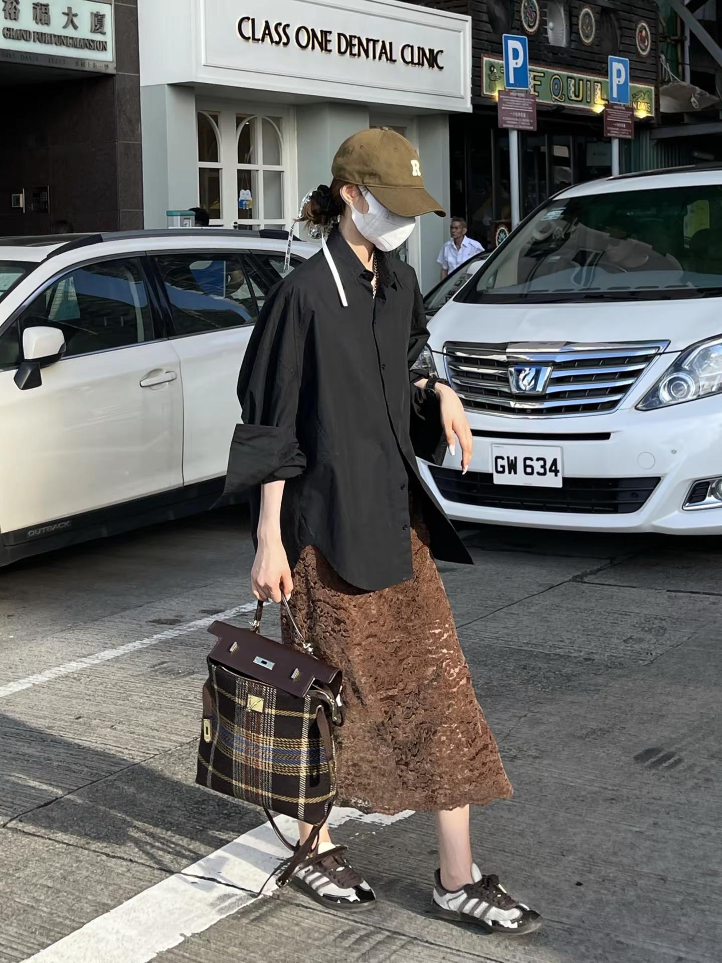 黑衬衫➕咖色蕾丝开衩半裙这么穿太洋气了。韩系穿搭 高级穿搭 黑衬衫 咖色蕾丝开衩半裙 拽姐穿搭