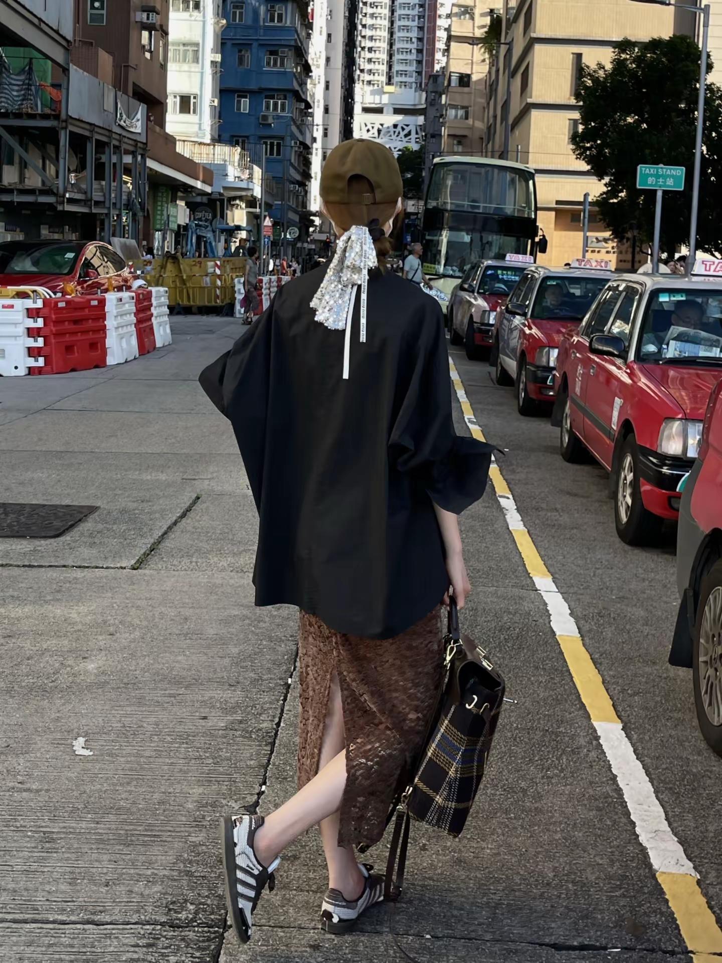 黑衬衫➕咖色蕾丝开衩半裙这么穿太洋气了。