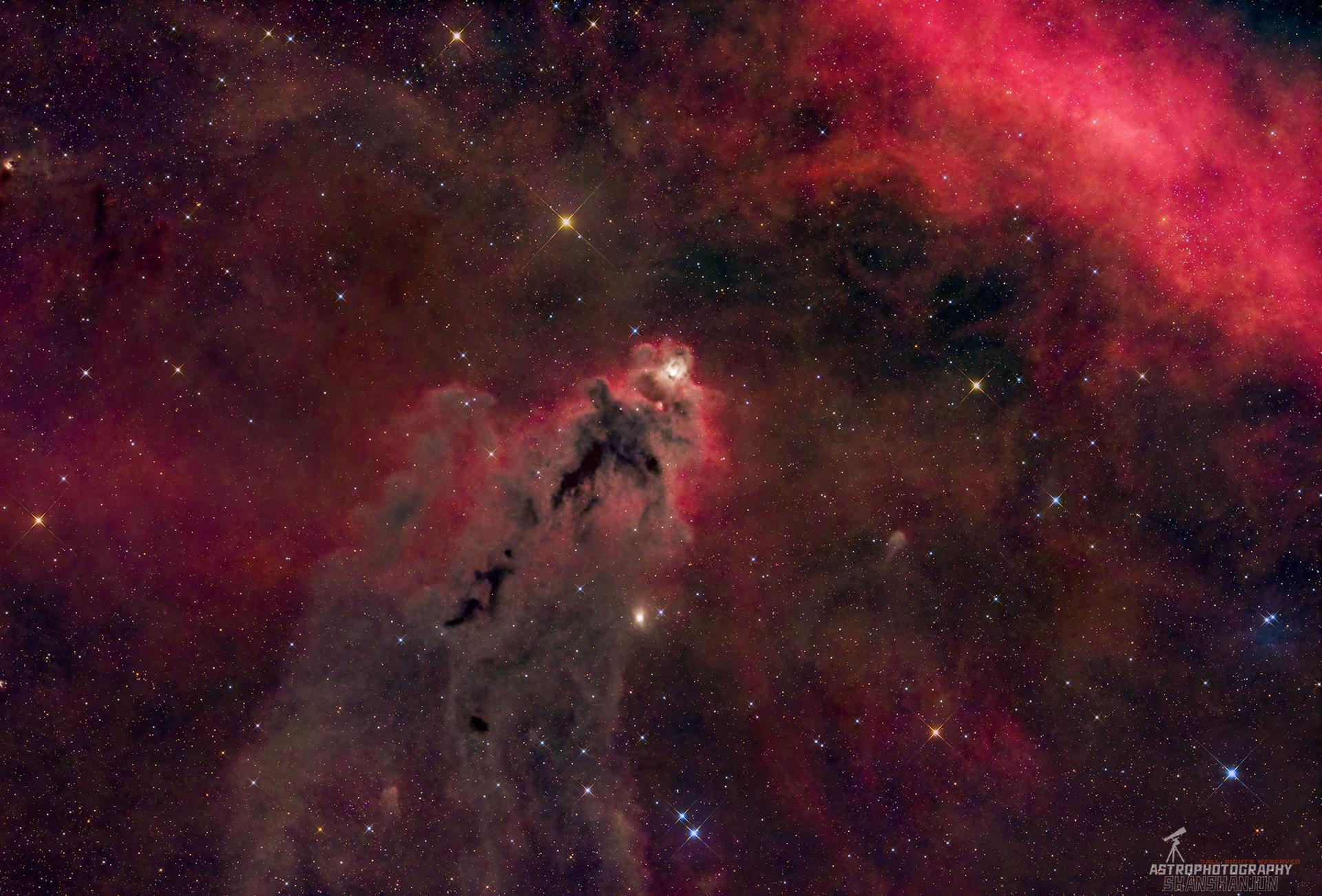 LDN1622 林茨暗星云。林茨暗星云,编号LDN 1622,别称Boogeyman Nebula,是猎户座方向的一个暗星云。该星云位于距离地球约1500光年处,靠近银河系平面及巴纳德环,覆盖范围在此距离下跨度约30光年。红外图像显示内部存在年轻恒星,并在其右上方区域形成蓝白色反射星云vdb 62。 林茨暗星云以剪影形态遮挡背景氢气辉光,气体尘埃中检测到富勒烯等复杂分子的微波辐射。作为恒星形成区,其分子组成研究为星际物质演化提供线索。暗星云的高密度区域是恒星诞生的摇篮,需借助射电或红外波段观测。 拍摄设