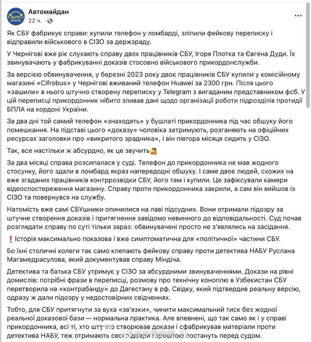 乌克兰国家安全局捏造间谍案的一次行动被法院揭穿:他们使用二手手机伪造了一名乌克兰边防军人员与俄罗斯联邦安全局(FSB)的聊天记录,并在对其家中的搜查中“找到”了这部手机。如果不是SBU特工自己够买这部二手手机时有监控录像和交易记录,这种栽赃基本上无解。