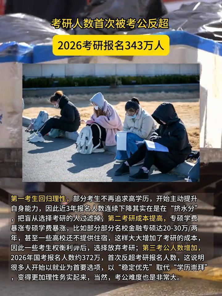 考研人数首次被考公反超,2026考研报名343万人。 "考研热"继续降温,创近五年新低,2026考研报名343万人,相比2025年减少45万,相比2023年峰值474万,直接减少131万。考研报名人数近十年首次出现的"三连降",甚至还出现了考研人数被考公反超的局面,真是让人意想不到。 短短三年时间,考研人数降幅达27.6%,按照如此速度,估计要不多久考研报名人数会跌破300万大关。考研报名人数下降,这意味着"考研热"显著退潮,为何考研热会骤减? ·第一、考生回归理性,部分考生不再追求高学历,开始主动提升自身能力,因此近3年报名人数连续下降其实在是在"挤水分",把盲从选择考研的人过滤掉。 ·第二、考研成本提高,专硕学费暴涨,专硕学费暴涨,比如部分名校金融专硕达20-30万/两年,甚至一些高校还不提供住宿,这样大大增加了考研的成本,因此一些考生权衡利弊后,选择放弃考研。 ·第三、考公人数增加,2026年国考报名人数约372万,首次反超考研报名人数,这说明很多人开始以就业为首要选项,以"稳定优先"取代"学历崇拜",变得更加理性务实起来,当然,考公难度也是非常大。