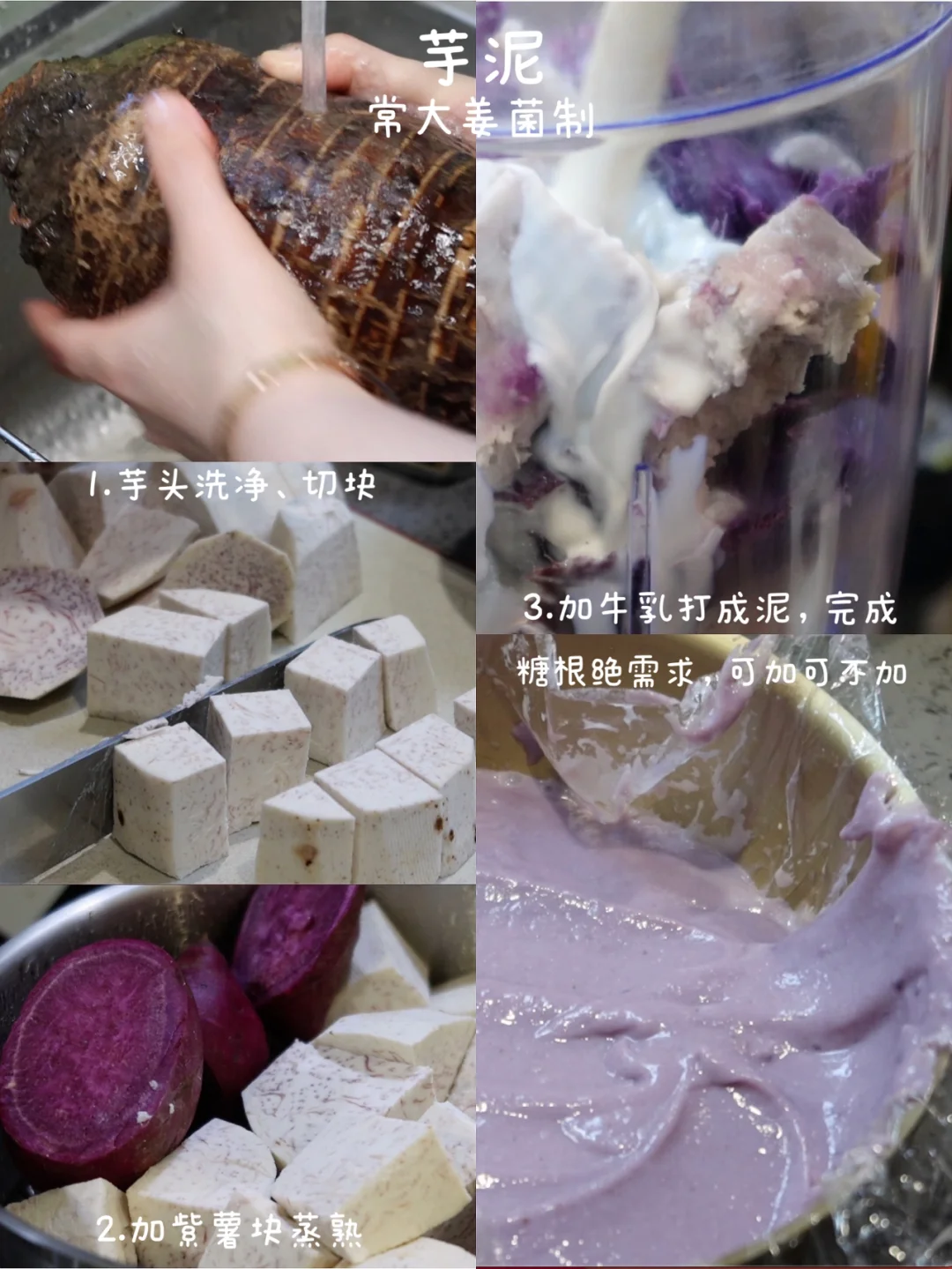 熟芋头250g、紫薯2个、糖15g、鲜奶200g左右