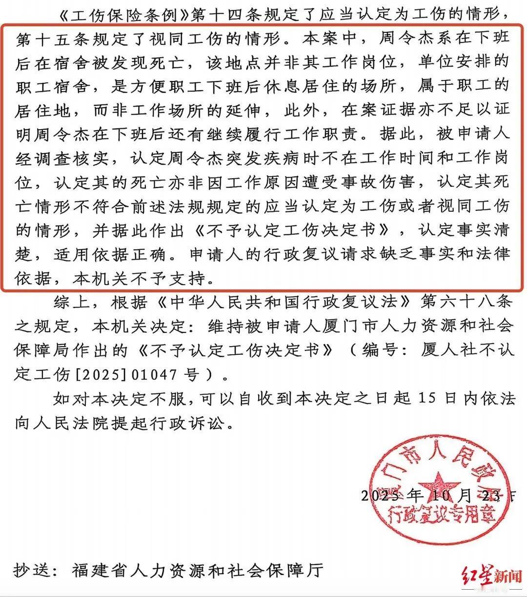 21岁员工宿舍猝死不认定工伤?凌晨搬宿舍+月加班45小时,这事没那么简单! 贵州21岁的周令杰入职厦门新能安公司三个半月后,猝死在公司宿舍。家属说他常从早上7点多干到晚上8点,7月28日下班后还按公司要求凌晨搬宿舍,监控里他疲惫到靠墙直喘,质疑是过劳死。可厦门人社局和市政府先后认定这不构成工伤。本文从事件细节入手,拆解法律争议点,看看工伤认定的边界在哪,也聊聊这事背后打工人该关注的权益问题。 一、21岁小伙猝死宿舍,监控里的疲惫身影太揪心 今年4月,刚满21岁的周令杰从贵州来到厦门,进了厦门新能安科技有限公司上班,岗位是二级生产技术员,平时就跟家人说自己在厂里“打螺丝”。谁也没想到,这份才做了三个半月的工作,竟成了他人生的终点。 7月29号下午,公司组长发现周令杰没上班,到宿舍一看,小伙子已经没了气息。急救记录显示,他被发现时意识丧失、皮肤大片青紫,心电图呈直线,警方很快排除了他杀。周令杰的哥哥说,弟弟中学时爱打蓝球、乒乓球,身体一直特别好,怎么突然就没了? 家属后来看到的宿舍监控,揭开了更多让人揪心的细节。7月28号晚上8点周令杰打卡下班后,因为原宿舍漏水,按公司要求得搬到六楼。监控显示,29号凌晨0点26分到1点23分,他分好几趟搬行李。视频里的他弯腰驼背,搬东西时还得靠在墙上歇一分钟,最后一趟甚至在门口反复打转,看着都分不清方向了。 更让家属难以接受的是,他们赶到公司想查劳动合同、考勤表和工作监控,全被公司拒绝了。好在从拿到的7月考勤能看到,这个月他上班20天,总工时205.5小时,光加班就有45.5小时,13天都是晚上8点才下班。家属怀疑,长期高强度工作加上凌晨搬家的劳累,才让他年纪轻轻就猝死了。 二、工伤认定引争议,法律边界到底在哪? 家属坚持认为周令杰的死该算工伤,可8月20号厦门人社局给出了不予认定的决定,10月市政府也维持了这个结果。这不是相关部门故意刁难,而是工伤认定有明确的法律标准,咱们掰开揉碎了说。 先看核心的法律依据,《工伤保险条例》第十四条和十五条说得很清楚,认定工伤或视同工伤,关键得满足“工作时间、工作岗位、工作原因”这几个条件。人社局认定不构成工伤,是因为周令杰死在宿舍不是车间,时间也不是上班时间,不符合这几个核心要求。 但家属这边也有自己的法律理由。律师提出,宿舍是公司管控的配套空间,凌晨搬宿舍是公司安排的任务,这应该算工作场所和工作时间的合理延伸。2025年11月刚出台的《关于执行若干问题的意见(三)》也提到,工作场所包括履行职责相关的合理区域,工作时间也涵盖完成临时任务的时间。 那为啥复议还是维持原判呢?这里的关键争议点在于“宿舍算不算工作场所延伸”。相关部门认为,职工宿舍就是用来休息的,和车间这种正经工作场所不一样。而且目前没有直接证据证明,周令杰的猝死和凌晨搬宿舍有必然的因果关系。这也给咱们提了个醒,遇到类似情况,一定要保留好任务通知、医疗证明这些能证明因果关系的证据。 另外还有个“过劳死”的问题,大家可能觉得累出人命就该算工伤,但目前我国法律里没有“过劳死”直接对应的工伤条款。一般得证明猝死和工作强度有直接关联,比如有长期加班记录、医院诊断证明劳累是诱因等,才能争取相关权益,这对家属来说举证难度确实不小。 三、网友吵翻了!公司和打工人的边界该怎么划? 这事一出来,网友的讨论直接炸了锅,两边的观点都特别鲜明。 支持家属的网友占了大多数。有网友说:“凌晨搬宿舍是公司要求的吧?搬完就出事了,这怎么能和工作没关系?”还有人吐槽:“月加班45小时,对21岁的小伙子来说强度也太大了,公司总不能一点责任都没有。”更有打工人感同身受:“我们经常加班到深夜,要是哪天出事了,是不是也不算工伤?想想就害怕。” 也有网友理性分析,觉得工伤认定得按规矩来。“法律就是这么规定的,不在工作岗位和时间出事,确实难认定工伤。”不过这类网友也大多认为,公司不能就此撇清关系,“就算不算工伤,出于人道主义,也该给家属合理的补偿。” 还有网友注意到公司拒绝提供完整考勤和合同的细节,直言:“要是没猫腻,为啥不敢给家属看?公司这态度太让人反感了,就算法律上没责任,道德上也说不过去。” 结论 周令杰的事让人惋惜又揪心,法律上的认定有明确标准,但情理上打工人的权益保护也该有更多考量。公司是不是该反思下用工强度?凌晨安排搬家就不能多考虑下员工身体?而对于咱们打工人来说,加班时一定要留意身体信号,保存好加班记录、任务通知等证据,万一遇到意外也能有维权依据。 最后想问问大家:你觉得公司宿舍算工作场所的延伸吗?凌晨按公司要求搬家后猝死,公司该承担更多责任吗?欢迎在评论区说说你的看法,也别忘了转给身边的朋友,一起聊聊咱们打工人该怎么保护好自己。