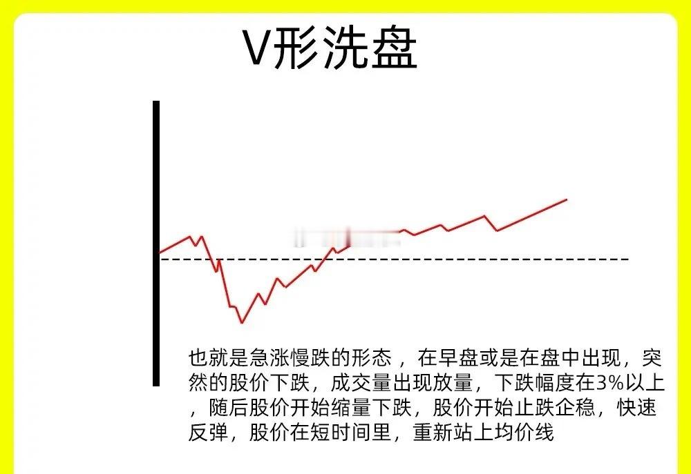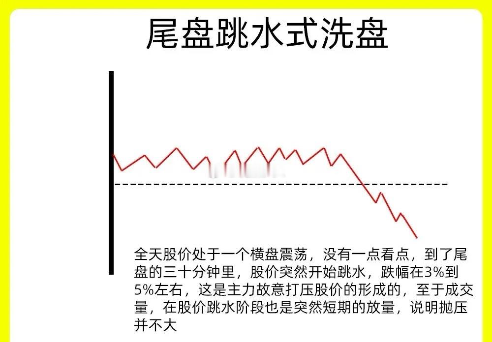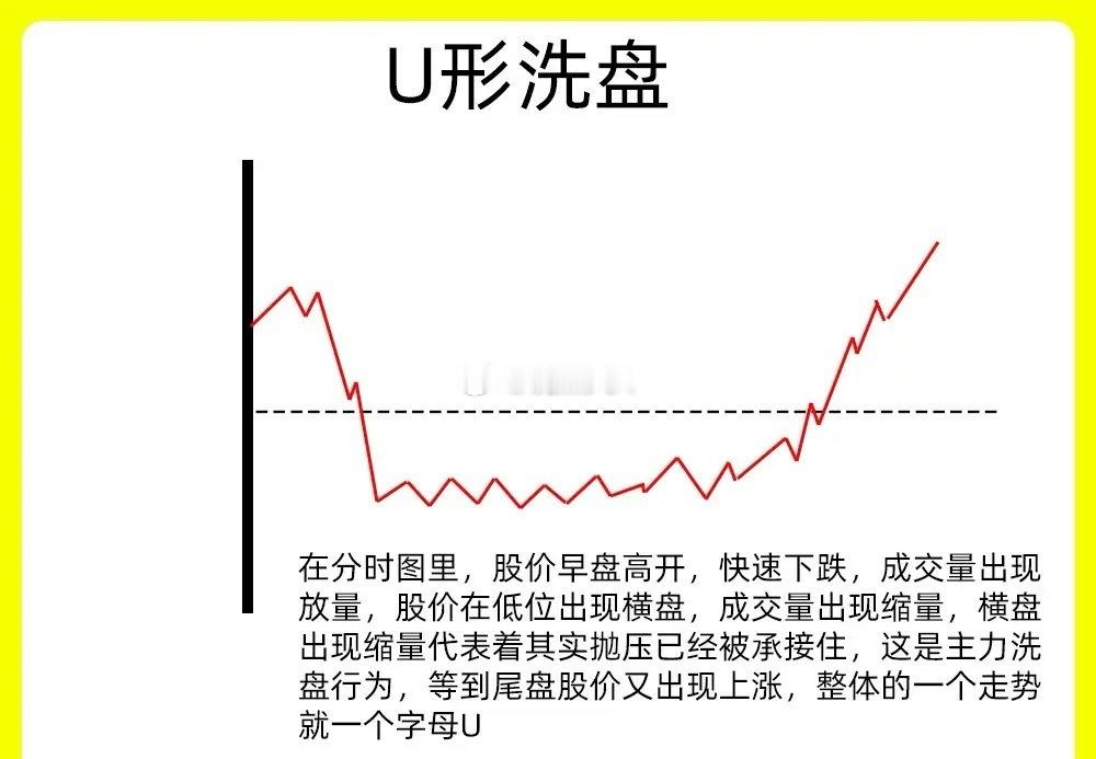 注意了!大部分短线选手的最为苦恼的事情,就在分时图中,判断主力是否在洗盘。作为短线选手,分时图是一个绕不开的,而且比日K线还重要。只有真正看懂分时图的形态,才能有效判断主力是在出货还是洗盘。今天老九就分享几种分时洗盘的形态,吃透这些走势,我想能立马提高盘感能力还是老规矩,点赞收藏或评论六六六支持一下,大A每天分享炒股干货,以免以后想温习找不到了一、V形洗盘也就是急涨慢跌的形态 ,在早盘或是在盘中出现,突然的股价下跌,成交量出现放量,下跌幅度在3%以上,随后股价开始缩量下跌,股价开始止跌企稳,快速反弹,股价在短时间里,重新站上均价线。这是典型的主力洗盘,主力故意打压股价,进行吸筹洗盘。二、U形洗盘在分时图里,股价早盘高开,快速下跌,成交量出现放量,股价在低位出现横盘,成交量出现缩量,横盘出现缩量代表着其实抛压已经被承接住,这是主力洗盘行为,等到尾盘股价又出现上涨,整体的一个走势就一个字母U。三、横盘震荡全天的走势都是1%左右震荡,均价线代表的平均持仓成本,而均价线全天几乎平行运行,成交量和之前对比,出现大幅的缩量,全天走势像织布机,在这种走势里,散户是很少有耐心的,走势很无趣四、冲高回落型洗盘这种走势一般是股价低位横盘阶段或是上涨趋势的初期,股价在分时图里,股价快速放量冲高,形成脉冲式上涨,上涨幅度在7%左右,但是没有出现涨停,随后股价开始回落,但是这个有一个细节,回落的时候成交量和上涨的时候对比,出现缩量。就形成放量上涨,缩量下跌的成交量格局。五、尾盘跳水式洗盘在分时图里,全天股价处于一个横盘震荡,没有一点看点,到了尾盘的三十分钟里,股价突然开始跳水,跌幅在3%到5%左右,这是主力故意打压股价的形成的,至于成交量,在股价跳水阶段也是突然短期的放量,说明抛压并不大。以上就是我们常见的分时图洗盘,当然有其他的,比如股价涨停炸板洗盘,主力利用股价炸板来清洗不坚定筹码。还有拱型洗盘,整体走势像一个N字。下方我配了对应案例图,建议文章和案例一起看。