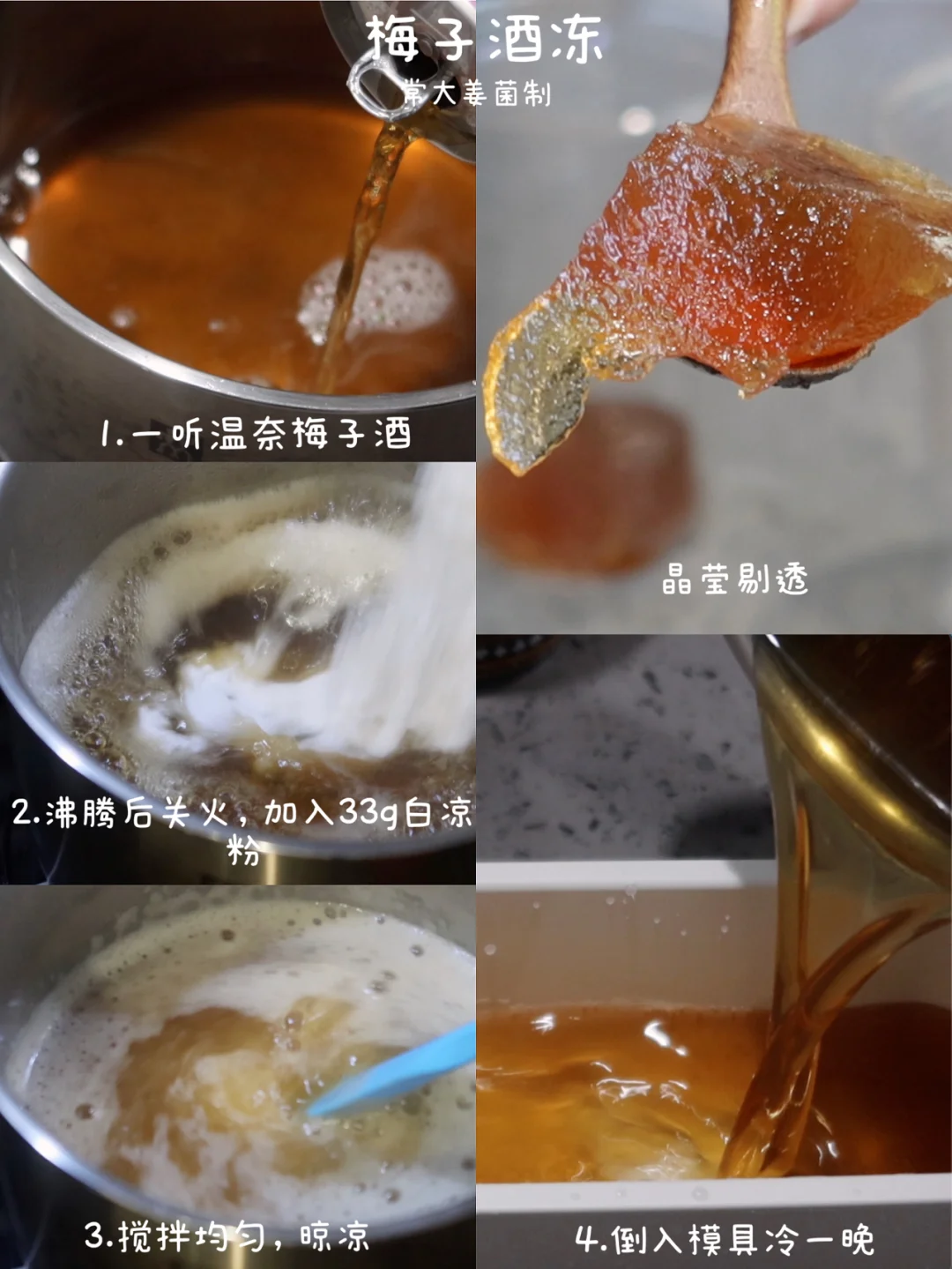①梅子酒一听小锅加热搅拌入白凉粉,均匀立刻停止,冰箱冰一晚~