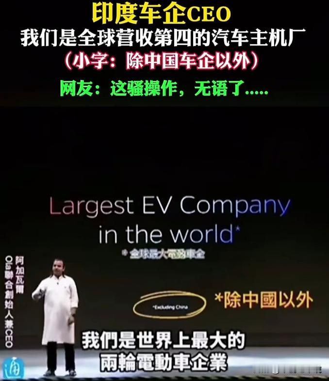 印度车企公然宣称印度是世界最大电动车国家,小字备注除了中国以外。 简直笑喷了,这不就是阿Q吗! 原来还可以这么排名,直接把第一剔除,自己就是第一。 说白了,现在的某些印度车企为了抢 “世界第一” 的名头,简直把 “自欺欺人” 这四个字玩到了登峰造极的地步,硬是靠着一句 “除中国以外” 的小字,把自己从电动车领域的追赶者,直接 “加冕” 成了所谓的 “世界最大电动车国家”,这操作看的人下巴都快掉地上了! 最近刷到这条消息的时候,差点把手里的奶茶喷到屏幕上,印度有家车企在宣传里大张旗鼓地宣称印度已经成了 “世界最大电动车国家”,结果眼睛往下一瞟,好家伙,一行小小的备注藏在角落里:“除了中国以外”。 合着现在排名还能这么玩?把真正的第一直接从榜单里剔除,剩下的自己不就自动升级成第一了?这逻辑要是放在上学时候,估计老师得拿着红笔在卷子上画个大大的叉,批注上 “审题不清,逻辑混乱”。 网友们看到这波操作,也忍不住开启了调侃模式,有人说 “这学的也太快了,雷总是不是该申请个‘小字专利’了?” 要知道,之前国内一些品牌在宣传的时候,偶尔会用小字标注一些补充信息,没想到现在直接被 “西天取经” 了,而且还取了个 “精华版”,直接用小字把最大的竞争对手排除在外。 这让人忍不住想起以前的故事,古时候是唐三藏历经千辛万苦去西天取经,求的是真经佛法,现在倒好,成了 “西天” 来取我们的 “粗粮”,只不过这 “粗粮” 取的不是什么先进技术,而是这种打擦边球的宣传套路,说起来还真是有点让人哭笑不得。 我们常说人类社会从石器时代结束后,就一步步告别了蒙昧,先是进入了靠农耕为生的农业革命时代,大家学会了种植作物、驯养牲畜,让生活稳定下来。 后来又迎来了工业革命时代,蒸汽机、电力的出现,让生产效率大幅提升,改变了整个世界的面貌;再到现在的数字化时代,互联网、人工智能渗透到生活的方方面面,让沟通、工作、生活都变得无比便捷。 可要是在这些进步后面都加上一句 “小字:印度除外”,那岂不是成了天大的笑话?毕竟不管是农业革命、工业革命还是数字化时代,都是全人类共同进步的成果,不是靠排除某个国家就能自己 “独占鳌头” 的。 就拿电动车领域来说,中国之所以能在全球占据领先地位,靠的不是什么 “排除法”,而是多年来在电池技术、产业链完善度、市场规模等方面的持续投入和积累。 从研发出更安全、更高效的动力电池,到建立起从上游原材料到下游整车制造的完整产业链,再到培育出一大批深受消费者认可的电动车品牌,每一步都是实实在在走出来的。 而某些印度车企不想着怎么提升自己的技术和产品力,反而靠玩文字游戏来 “争当第一”,这种做法不仅骗不了消费者,反而会让自己在全球市场上失去信誉。 毕竟消费者买电动车,看的是续航里程、充电速度、安全性能这些实实在在的东西,不是看你宣传里玩了多少文字技巧。 你就算把自己宣传成 “除中国外的世界最大电动车国家”,可产品质量不过关,续航虚标、充电慢、故障频发,照样没人会买账。 而且在全球一体化的今天,任何一个国家的产业发展都离不开与其他国家的交流和竞争,靠排除对手来 “夺冠”,本质上就是一种逃避竞争的行为,最终只会让自己停滞不前。 当然了,以上这些都只是我个人的看法,每个人对于这件事可能都有不同的想法,不知道大家看到印度车企这波 “小字排除法” 的操作,是觉得好笑,还是有其他不一样的观点呢?欢迎在评论区里一起聊聊。