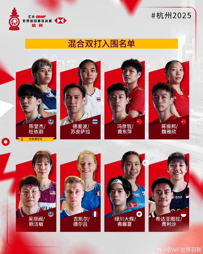 公布2025年世界羽联年终总决赛入围名单,中国队:【男单】石宇奇、李诗沣【女单】王祉怡、韩悦【男双】梁伟铿/王昶【女双】刘圣书/谭宁、贾一凡/张殊贤【混双】冯彦哲/黄东萍、蒋振邦/魏雅欣