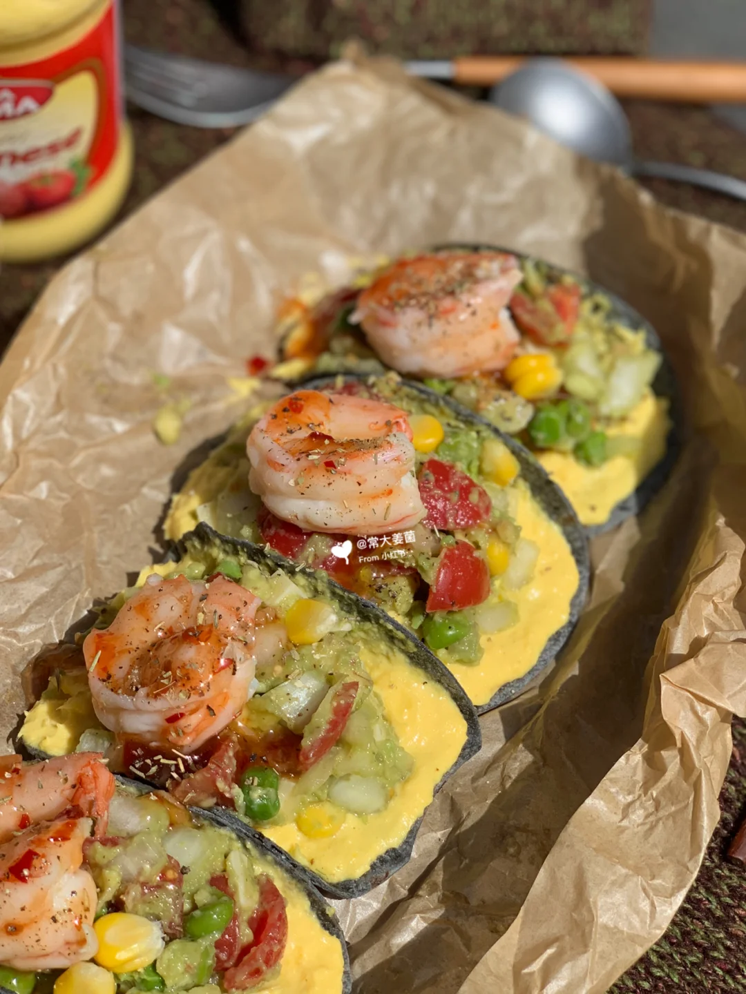 饼子、玉米酱、牛油果酱、大虾。一次摆上,完成!🥳