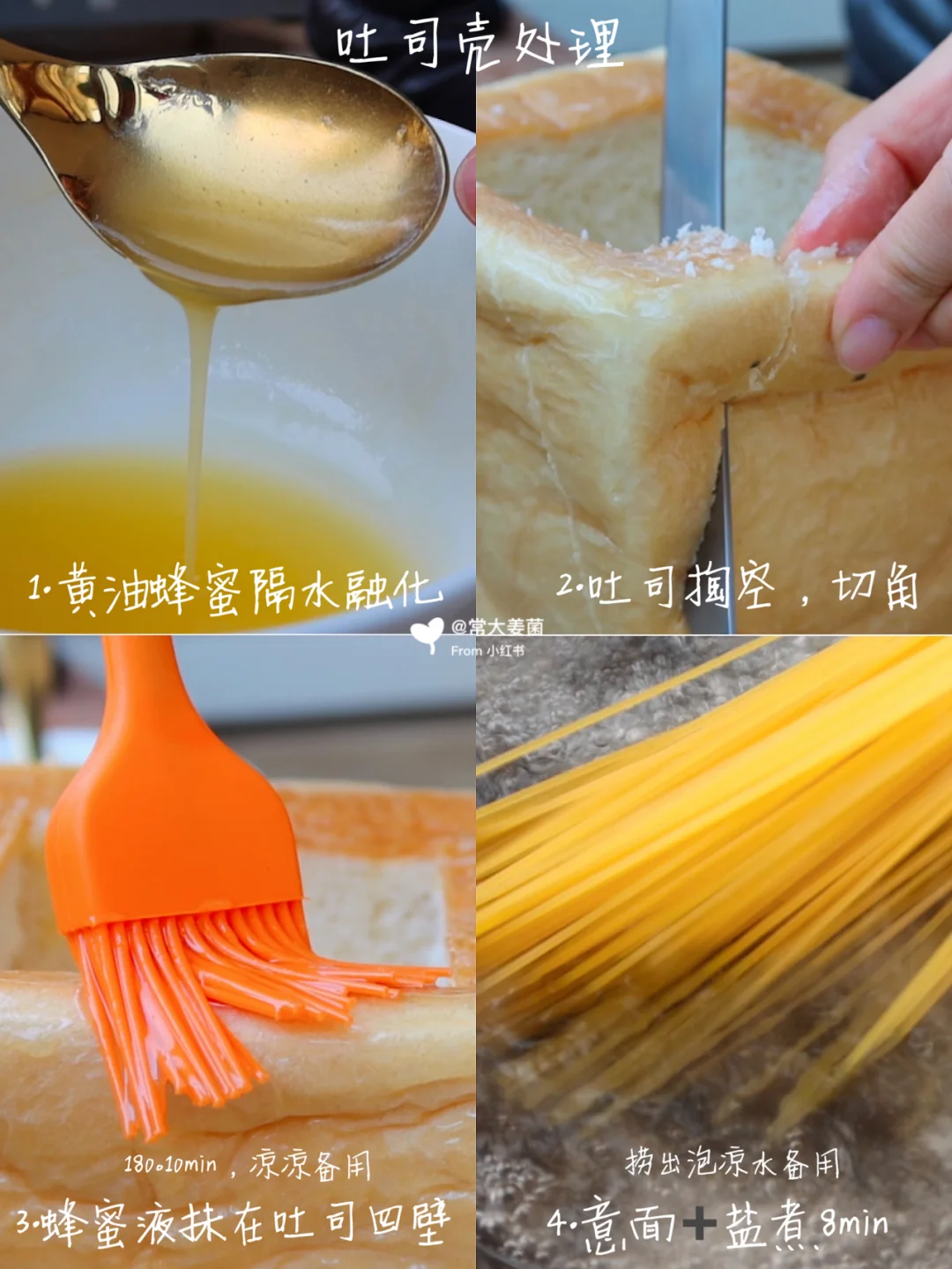 1.吐司用刀沿四边,留着厚度,掏空,黄油蜂蜜融化混合,抹在吐司盒子外壁和顶部四边,180°10min,凉凉备用