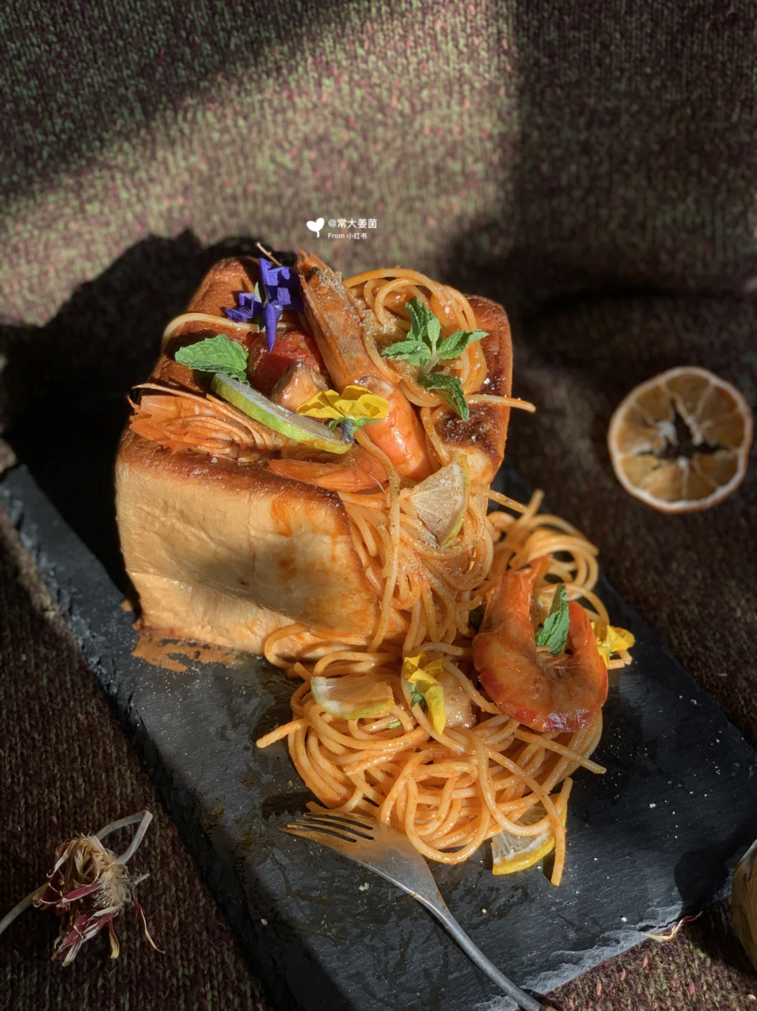 3.将虾➕百里香➕黑胡椒煎熟,下番茄➕一整颗柠檬挤汁,紧接着番茄料包下锅,意面下锅,意面水倒一勺子进去,搅拌均匀,直至收汁完成,装进吐司盒子里装盘(撒料包欧芹乳酪碎和黑胡椒碎)仪式感的一餐就完成喽~