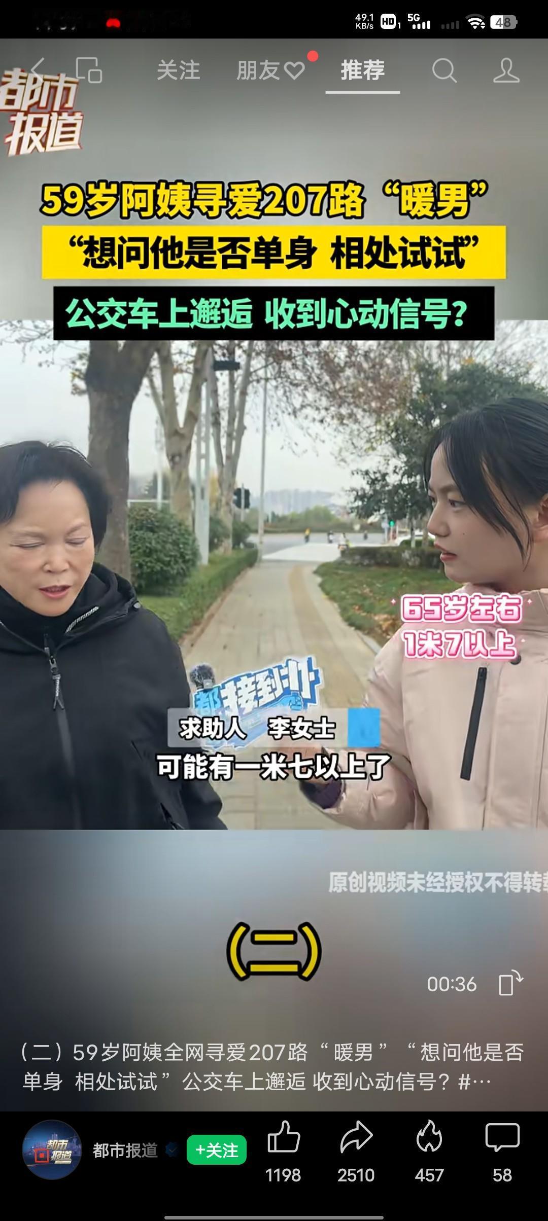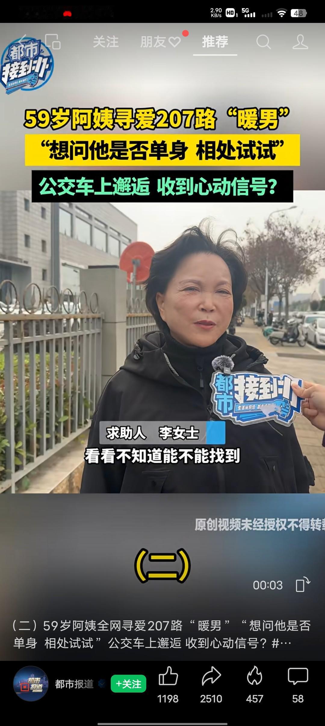你相信一见钟情吗?这算不算就是一见钟情呢?如果你是李女士,你会有她那么大的勇气吗? 59岁的阿姨寻爱207路“暖男” 求助人李女士:当时我是要坐207路车,我看到一位男士就随口问了一句,你知道207路站台在哪里吗?那位大哥说,就在前面不远,他也是要乘坐207的。当时车上很多人,我就站在中间,车在左拐的时候,我给晃了一下,他扶了我一把。 他在65岁左右,可能有一米七以上,很有气质,感觉像个老干部一样,我很后悔没有留个联系方式。我是单身如果能找到他,想知道他是不是单身,如果都是单身的话,可以交往一下,我觉得第一眼的感觉不会错! 我觉得阿姨有点唐突了,如果人家大哥有家庭,你这样会不会给别人带来不好的影响?说实话,我挺佩服阿姨的勇气,如果是我,我绝对没勇气这样曝光出来。也许会有人说,晚年时期想爱的时候就大胆去爱吧!毕竟要爱也要争分夺秒了,就算夕阳无限好,也已近黄昏了! 也是,能爱的就大胆去爱吧,别让自己把遗憾带进棺材里。