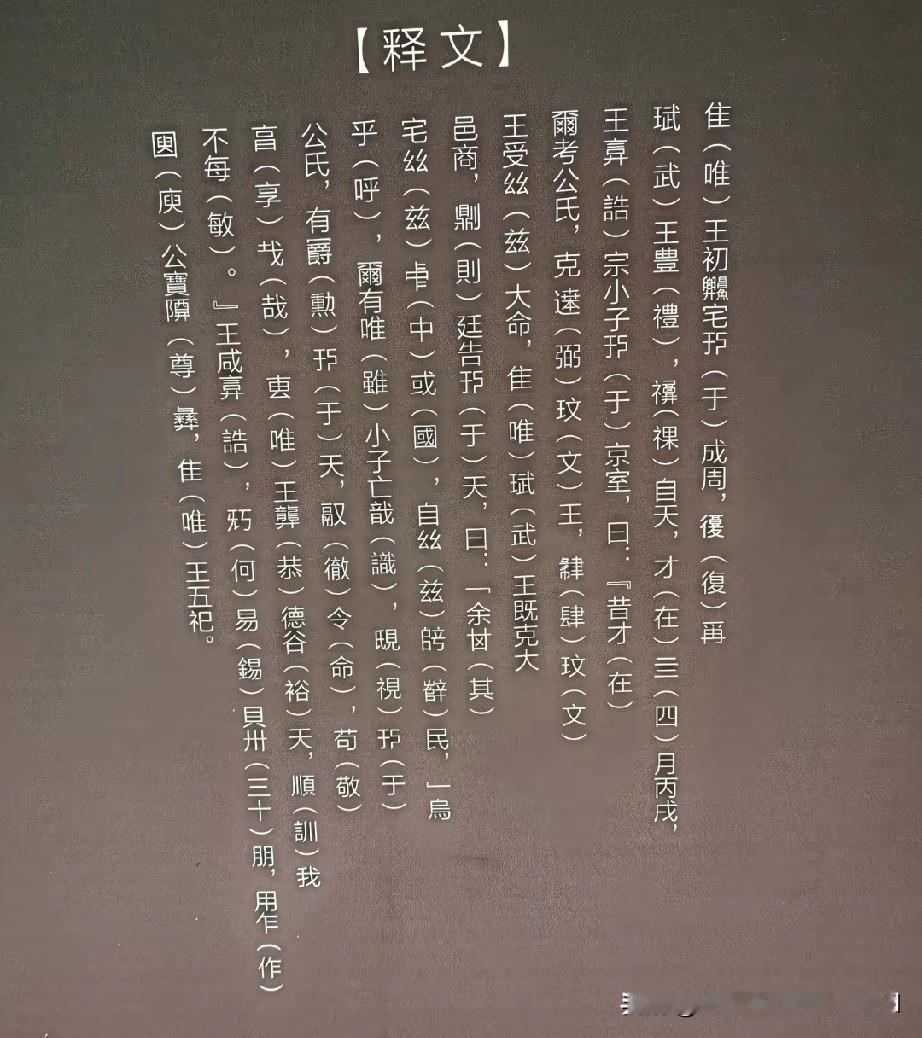 何尊铭文,还原了最早的中国。 并且纠正了成周等于洛邑的人为绑定。 进一步证明了, 成周就是周朝都城的代名词。 等同于我们现在称的首都。 用“成周指洛邑”的后世语境, 去解读何尊铭文, 就不会出现给武王定遗愿, 替成王迁都, 以及无法自圆其说的成周早于雒邑的事实。 通过锚定铭文时代、 立足金文自证、 结合考古实证三层逻辑, 剥离后世关联。 才能客观的反映出何尊铭文的实际内容。 1. 优先锚定何尊铭文的时代,划清语境边界 :何尊是周成王时期器物,铭文记载“唯王初迁宅于成周”,对应成王五年。而史料显示洛邑大规模营建始于成王七年,从时间线看,何尊的“成周”绝不可能是尚未建成的洛邑。东周后“成周=洛邑”的固定关联,以及《汉书》等后世文献的相关绑定记载,都不能倒推解读这件西周早期铭文,避免出现时空矛盾。 2. 以同时期金文互证,拒绝后世概念代入 :解读何尊的“成周”,应优先对照西周早期同类铭文。比如成王时期的《盂爵》有“唯王初贲于成周”,《德方鼎》有“惟三月,王在成周”,这些铭文里的“成周”均无指向洛邑的语境,多和祭祀、册命相关。同时期还有“新邑”这一称谓,如臣卿鼎“在新邑”,新邑鼎“王来奠新邑”,这些铭文可相互印证,明确西周早期“成周”“新邑”是特定时期的都城相关称谓,而非指向洛邑的固定地名。 3. 依托考古实证校验,不盲从文献关联 :目前汉魏洛阳故城一带,并未发现西周时期的成周城遗址,东周成周城才被考古证实是洛邑的一部分。何尊铭文的解读可结合周公庙出土的新邑卜甲、岐山的新邑戈等同期考古遗存,它们能佐证成王时期“成周”“新邑”相关的都城活动,但均无法关联到洛邑。这种考古实证能有效切断后世文献中“成周指洛邑”的语境干扰,还原铭文原始含义。 4、随着周原遗址的不断考古发现,以及丰镐遗址的考古发现。 越来越清晰的展现西周的历史。 越来越证明, 成周就是指周人的都城。 就比如北京的代名词是首都。 所以,首都就是指北京。 同样,西周的都城的代名词是成周, 所以,成周就是指丰镐。 这样来解读何尊铭文, 不仅逻辑清晰,更重要的是, 无人为的语境关联导致时间与空间的矛盾。 何尊铭文原文 唯王初迁宅于成周,复禀武王礼福自天。四月丙戌,王诰宗小子于京室曰:“昔在尔考公氏,克逑文王,肆文王受兹大命。唯武王既克大邑商,则廷告于天曰:‘余其宅兹中国,自之乂民。’呜呼,尔有唯小子亡识,视于公氏,有庸于天,彻命敬享哉!助王恭德欲天,临我不敏。”王咸诰,何赐贝卅朋,用作□公宝尊彝。唯王五祀。 直译, 周成王初宅成周,又依照周武王的礼仪举行祭祀,祈求上天降下福泽。 在四月丙戌这一天,成王在京室对同宗族的晚辈训话道。 从前你们的先父,能够辅佐周文王,因此周文王才承接了上天授予的统治天下的天命。 到了周武王攻克强大的商朝之后,就在朝堂之上祭告上天说。 我要在天下中心建都居住,从这里治理天下的百姓。 唉!你们这些年轻人没什么见识,要效仿你们先父,像他那样对上天有功,遵行天命,恭敬地祭祀先祖与上天啊。 要协助我践行恭敬的德行以顺应上天,包容我这样不够聪敏的人。 成王的训话结束后,赏赐给我三十串贝币。 我便用这些贝币铸造了这件珍贵的礼器,用来祭祀先祖□公。 这一年是周成王五年。 从成王效仿武王祭祀,再到京室训话, 祭祀的场所和京室, 能在还没有建的洛邑吗? 造成何尊铭文严重失实的关键就是,把西周的成周当做东周的成周 。 再看与何尊同属成王时期的《盂爵》《德方鼎》等铭文,提及的“成周”均围绕祭祀、册命等王室核心礼仪,并无任何指向洛邑的地理语境。 而西周早期铭文中指代洛邑的多是“新邑”,如臣卿鼎、新邑鼎中的相关记载,这一称谓与何尊的“成周”明确区分。且“京室”作为王室重要礼制空间,在西周早期金文里,始终与周人关中故地的都城关联紧密,从未出现在指向洛邑的语境中,进一步说明训话与祭祀场所不在洛邑。 汉魏洛阳故城及周边的洛邑相关区域,至今未发现成王五年对应的西周早期大型礼制建筑遗址,东周时期的成周城遗址才与洛邑关联,这印证了成王五年洛邑无举办礼仪活动的物质基础。另一方面,周原遗址发现了西周贵族宗庙、祭祀坑等大量礼制遗存,丰镐遗址也有文王、武王时期奠定的都城框架,且周公庙出土的新邑卜甲、岐山的新邑戈等同期遗存,均将成王时期的都城活动锁定在关中区域。这些遗址具备举行祭祀和宗族训话的设施条件,与何尊铭文的活动场景高度契合。 陕西师范大学臧振教授等学者提出的“丰镐成周说”,就认为西周早期的“成周”实际指丰镐。丰镐作为文王、武王奠定的都城,有完善的宗庙和礼制建筑;周原作为周人宗族圣地,也有密集的贵族宗庙遗存,二者都具备承接成王祭祀、训话的条件。 这一观点也与 成周是西周都城代名词相关。解读何尊铭文,少些人为关联语境,多些金文语境,才能贴近何尊铭文的真实反映和真实内容。