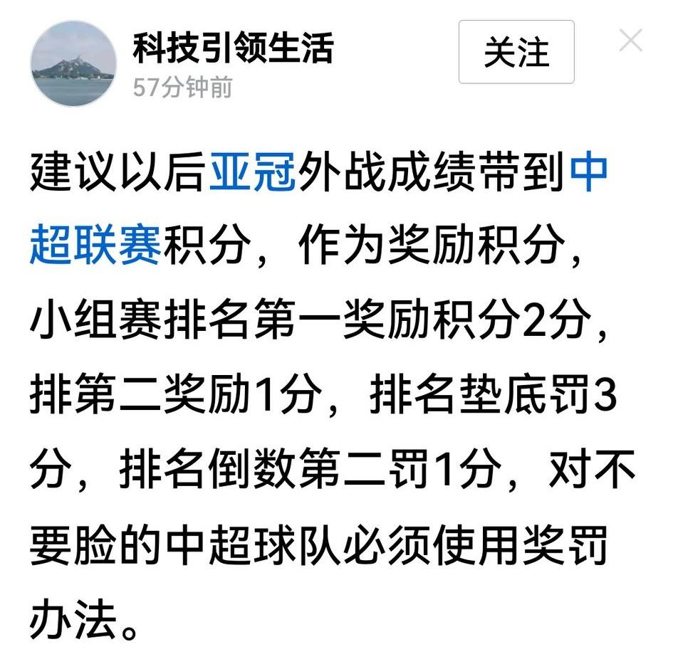 你别笑,有球迷呼吁把亚冠排名带到中超,用奖惩机制对中超球队打亚冠进行激励,还真有一定道理。 中国球迷看到亚冠积分榜上三支中超球队依次垫底无不来气,皆因为了中超排名有的是留力有的是放弃,好不容易争到的亚冠资格又不尽力,球迷看亚冠自然憋屈。 提这建议的球迷应该不只是说气话,而是对准各队都看重联赛成绩的痛点来深化足球改革。当然,中超球队想在亚冠东区争第一第二为联赛加分几无可能,但对亚冠排名末尾的球队多扣几分倒是强刺激。比如海港今年扣掉3分,申花就是中超冠军并获明年亚精赛唯一资格,也正好解了海港不想打亚冠之危,可谓两全齐美。