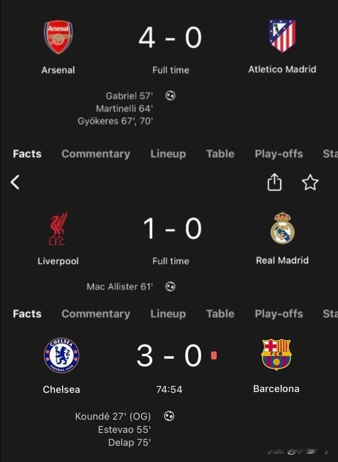 西甲联赛这是怎么啦?近期双方交手的13粒进球全由英超球队包揽。 - 皇家马德里被目前联赛一场都赢不了的利物浦全面压制。 - 巴塞罗那被切尔西血洗,对方今天本可以进6个球的。 - 阿森纳不费吹灰之力就4比0狂胜马德里竞技。 英超在质量上现在完全领先好几个档次。