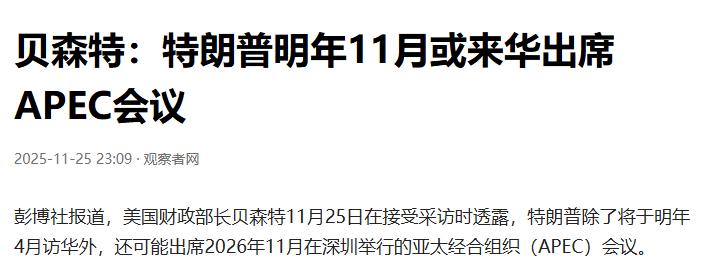 美国财长贝森特在接受采访时透露,特朗普除了将于明年4月访华外,还可能出席2026