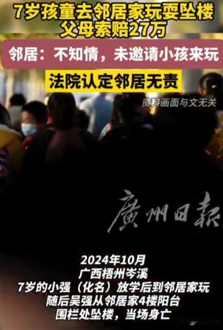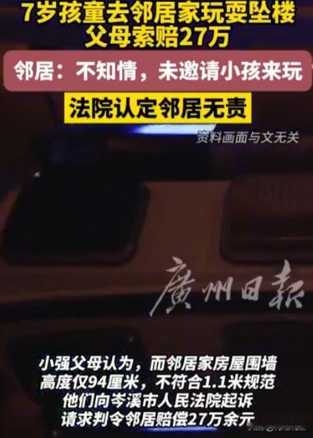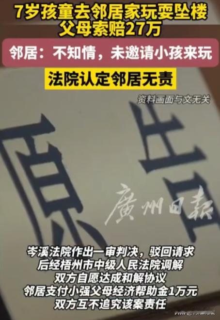 广西岑溪,7岁的小强放学没回家,去了同村10岁小云和7岁小朵家,当时小云和小朵父母不在,房屋无人看管,三个孩子就在屋内玩耍,玩耍时小强两次爬阳台围栏,都被小云拽下并警告危险,可小强没当回事,第三次趁小云转身,小强快速爬上围栏外侧,等小云察觉伸手拉已来不及,小强从4楼阳台坠落,沉闷落地声打破宁静,小云和小朵大哭后跑找亲属求助,还拨打120和报警电话,但小强因伤势过重当场死亡。 2024年10月,7岁的小强放学后没回家,跑到同村小云和小朵家玩,当时小云和小朵父母不在,房子没人管,三个孩子就在屋里撒欢。 小强这孩子活泼好动,对啥都充满好奇,在屋里玩了一会,看到外面的阳台,他觉得外面肯定有好多好玩的东西,就想着爬到围栏上去看看。 第一次,小强刚爬上围栏,就被小云发现了。 小云赶紧跑过去,一把将他拽了下来,还严肃地警告他,这里危险,不能爬。 小强当时点了点头,可心里根本没当回事。 没过一会,小强又忍不住了,再次去爬围栏。 小云眼疾手快,又一次把他拉了下来,再次强调了危险性。 可小强就像没听见一样,依旧我行我素。 第三次,小云转身去拿东西,小强瞅准这个机会,迅速爬上了围栏外侧。 等小云发现的时候,已经来不及了。 小强脚下一滑,整个人从4楼掉了下去。 小云和小朵吓得大哭起来,她们完全不知道该怎么办。 小云想起找大人帮忙,赶紧跑去叫亲属,亲属来了之后,一边安慰她们,一边拨打了120和报警电话。 可小强伤势太重了,等急救人员赶到的时候,他已经没了生命的迹象。 这起悲剧发生后,小强的父母觉得,邻居家的围栏存在安全隐患,是导致小强死亡的主要原因。 于是,他们把小云父母告上了法庭,索赔27万。 邻居家,到底有没有责任呢? 小强父母认为,邻居家围栏有问题,没有尽到安全保障义务。 而邻居觉得,房子建的时候没有现在的规范,围栏对小强也不算必然危险,而且孩子来家里玩,他们也没主动邀请,孩子劝阻和救助也到位了。 从法律角度看,民法典规定,行为人因过错侵害他人民事权益造成损害的,应当承担侵权责任。 那邻居家有没有过错呢? 房子建造时间较早,当时没有现在这么严格的安全规范,围栏虽然可能存在一定风险,但不能直接认定为必然危险。 而且,邻居并没有主动邀请小强来家里玩,是小强自己跑过去的。 小云在发现小强爬围栏时,两次进行劝阻和救助。这已经尽到了相应的注意义务。 民法典规定,无民事行为能力人、限制民事行为能力人造成他人损害的,由监护人承担侵权责任。监护人尽到监护职责的,可以减轻其侵权责任。 小强才7岁,属于无民事行为能力人。 小强父母作为监护人,没有尽到监护责任,才是导致悲剧发生的主要原因。 他们应该时刻关注小强的动向,避免他做出危险行为。 邻居家既然房子有围栏,就应该保证围栏绝对安全吗? 这种想法,其实不太对。 民法典里对于安全保障义务的规定,是要根据实际情况来判断的。 不能要求一个老房子,按照现在的标准去改造围栏。 如果邻居家围栏确实有问题,要承担多少责任呢? 这要根据具体情况来定,如果围栏存在明显缺陷,而且这个缺陷与孩子的死亡有直接因果关系,邻居可能要承担一定责任。 但在这起案件中,围栏的问题,并不足以直接导致小强摔下去。 最终,一审法院经过审理,判决邻居没有责任。 法院认为,邻居家房子建造情况特殊,围栏对小强不算必然危险,邻居也没有主动邀请小强,孩子劝阻和救助也到位了,小强父母没尽好监护责任才是主因。 小强父母不服一审判决,提起了上诉。 二审法院进行了调解,最终邻居给了1万经济帮助金,双方达成和解。 这1万不是赔偿,而是人道帮助。 家长一定要时刻关注孩子的安全,不能让孩子处于危险之中,邻里之间也要互相理解,遇到问题多沟通。 小强父母索赔27万,是不是有点过分呢? 从法律角度看,他们可能是因为失去孩子过于悲痛,想通过索赔来寻求一些心理安慰。 但从实际情况和法律责任来看,他们的诉求缺乏依据。 如果邻居坚决不给这1万经济帮助金,法律会支持吗? 法律不会强制要求邻居给这1万,因为这1万是基于人道主义考虑,双方自愿达成的和解。 如果邻居不愿意给,法律也不会强迫。 (主要信源:7岁小孩从邻居家阳台坠亡,父母索赔27万元!邻居称不知情且无看护义务,拒绝赔偿,法院判了→ 2025-11-24 11:20·大众网泰安)