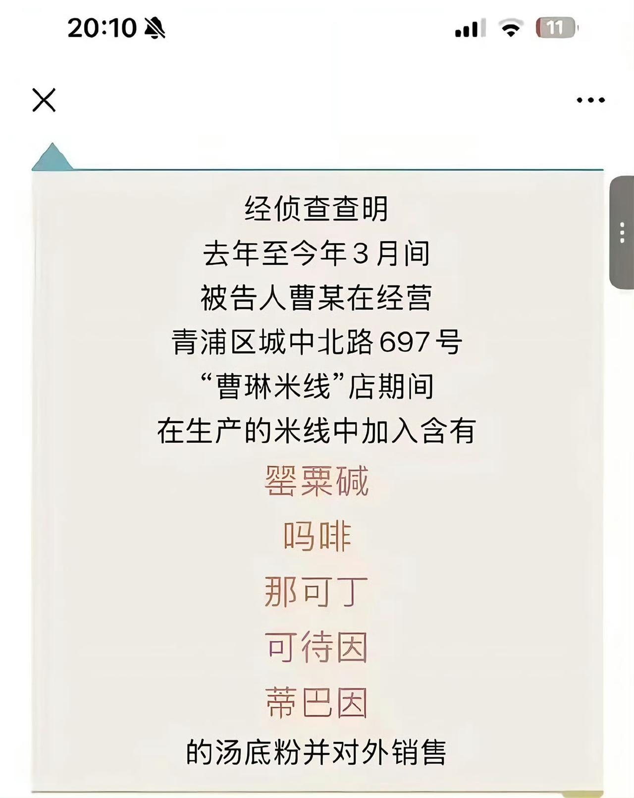 官方通报一出来,全网都炸了——老板曹某偷偷在汤底加罂粟成分,吗啡、可待因样样都有,难怪有人说“一天三顿吃不腻”“几天不吃就心慌”,原来不是嘴馋是毒瘾犯了! 这家店之前多火啊?网友晒着“下高铁直奔门店”的打卡照,说“带对象吃曹琳米线是仪式感”,连免费续粉、送卤牛肉的福利都被夸成良心。可谁能想到,这些“欲罢不能”的美味,全是化学操控的骗局。 现在店铺关了,老板被起诉,最高可能判死刑。网友们又气又懵,有人自嘲“我的青春喂了毒米线”,还有人开始警惕:“常吃的那家麻辣烫会不会也有问题?” 说实话,市井美食的魅力该是天然食材的香,不是靠违禁品勾着人。这家店开了5年才被查出,也暴露了小店抽检的漏洞。 那些“好吃到上瘾”的馆子,真得多留个心眼。毕竟舌尖上的安全,容不得半点猫腻。吗啡成瘾 曹琳米线 米线