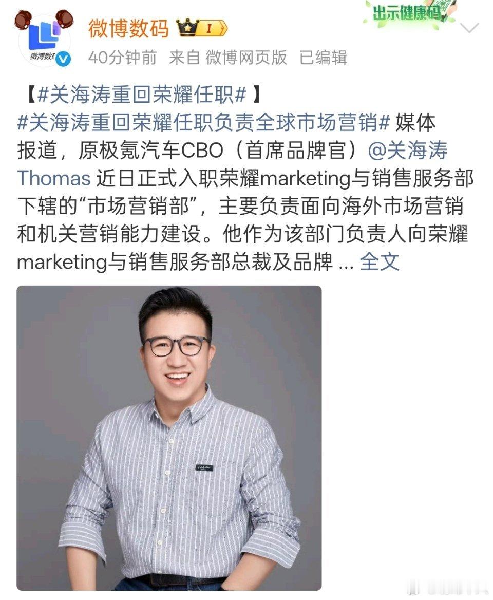 关海涛重回荣耀任职赵明和姜海荣离开了荣耀,关海涛回到了荣耀。关海涛从手机行业跳到新能源汽车行业,转一圈后又回到了熟悉的手机行业。