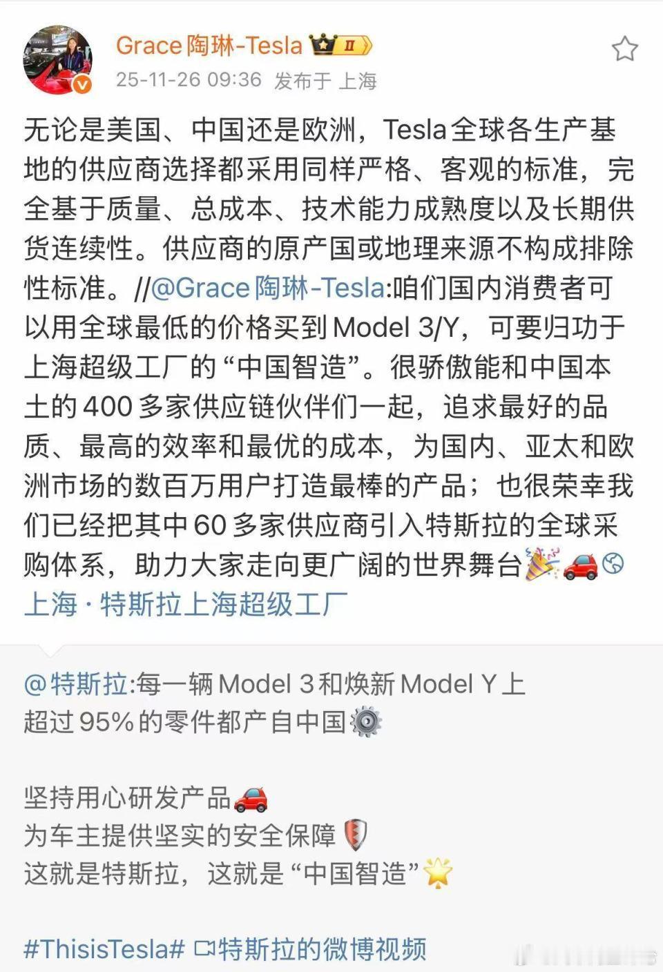 特斯拉副总裁辟谣“供应链去中国化 今日,特斯拉副总裁陶琳发文称,无论是美国、中国还是欧洲,特斯拉全球各生产基地的供应商选择都采用同样严格、客观的标准,完全基于质量、总成本、技术能力成熟度以及长期供货的连续性,供应商的原产国或地理来源不构成排除性标准。 陶琳指出,特斯拉在中国市场的性价比要归功于特斯拉上海超级工厂的“中国智造”,特斯拉很骄傲能和中国本土的400多家供应链伙伴们一起,追求最好的品质、最高的效率和最优的成本,为中国、亚太和欧洲市场的数百万用户打造最棒的产品,也很荣幸特斯拉已经把其中60多家供应商引入特斯拉的全球采购体系。