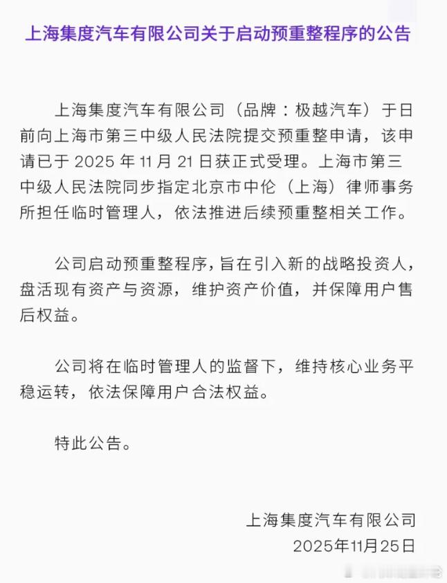 极越提交重整申请上海集度汽车有限公司(品牌名“极越汽车”)于11月25日通过官方微信公众号发布公告,宣布公司已向上海市第三中级人民法院提交预重整申请,且该申请已于2025年11月21日获正式受理。