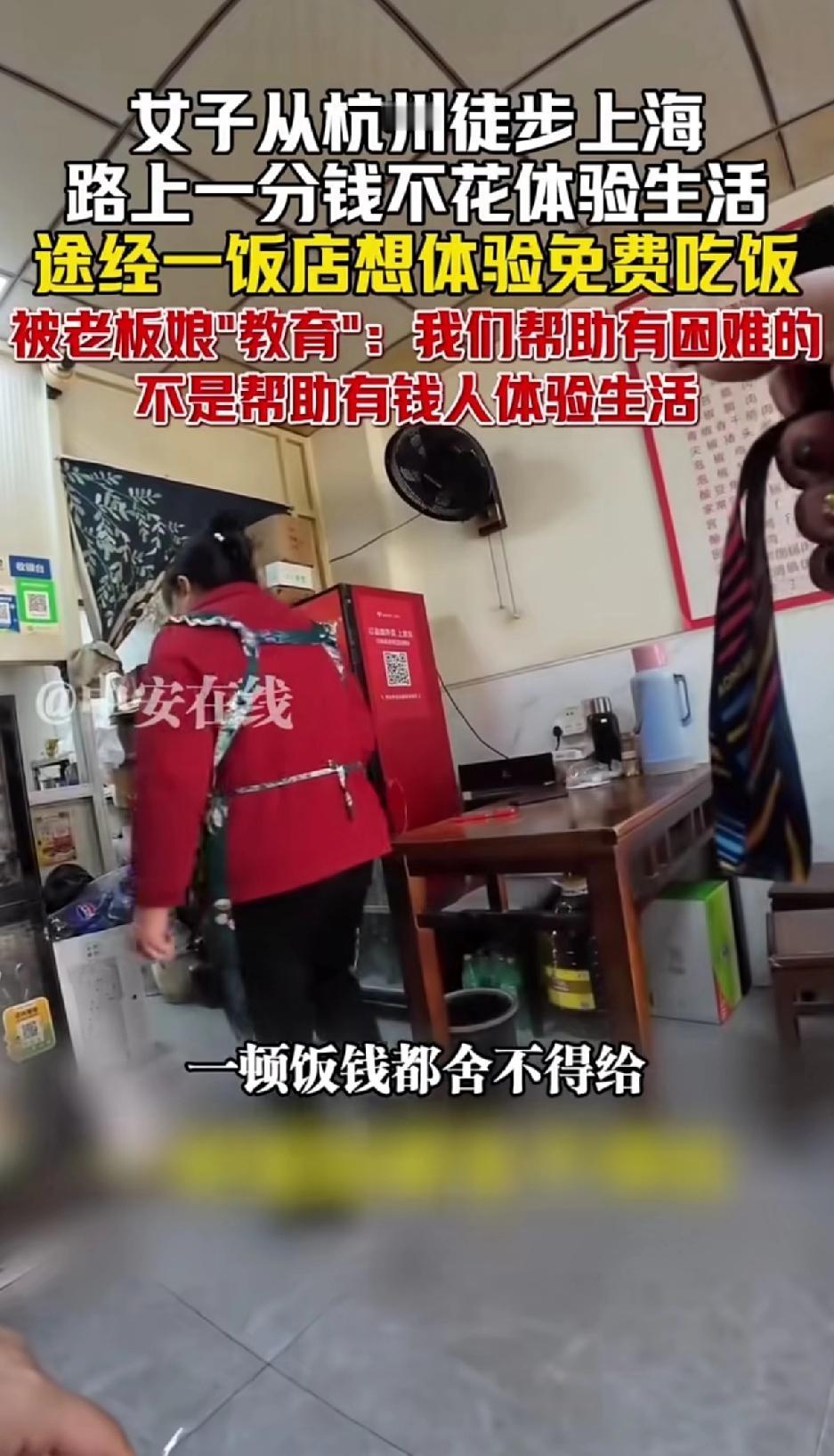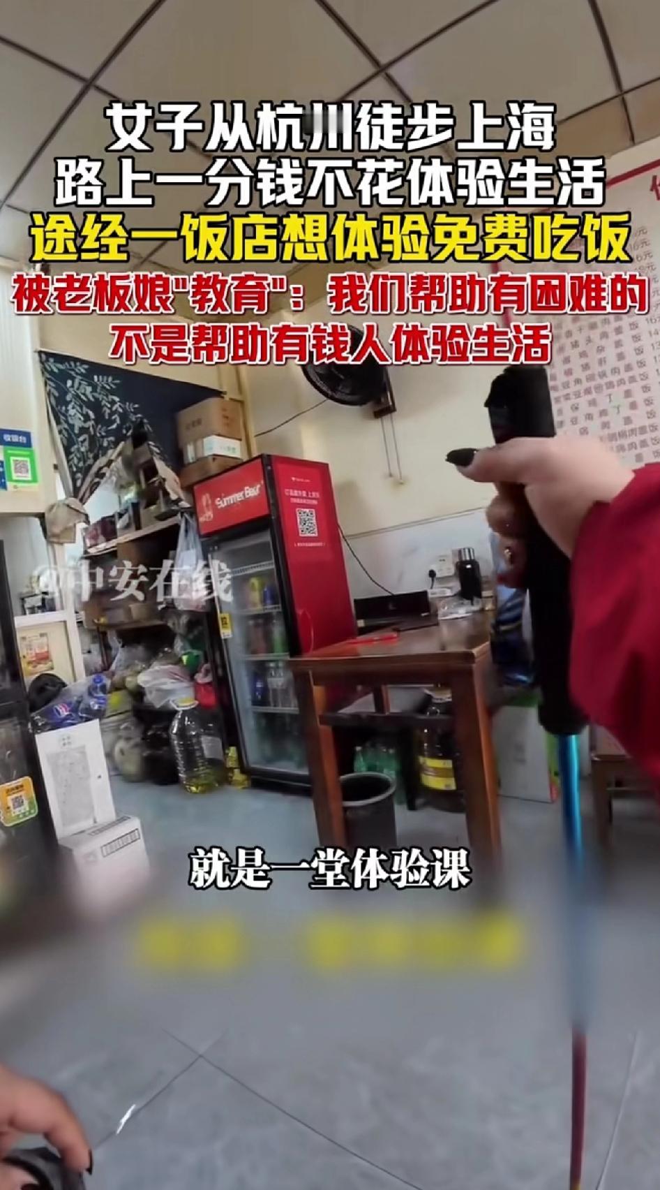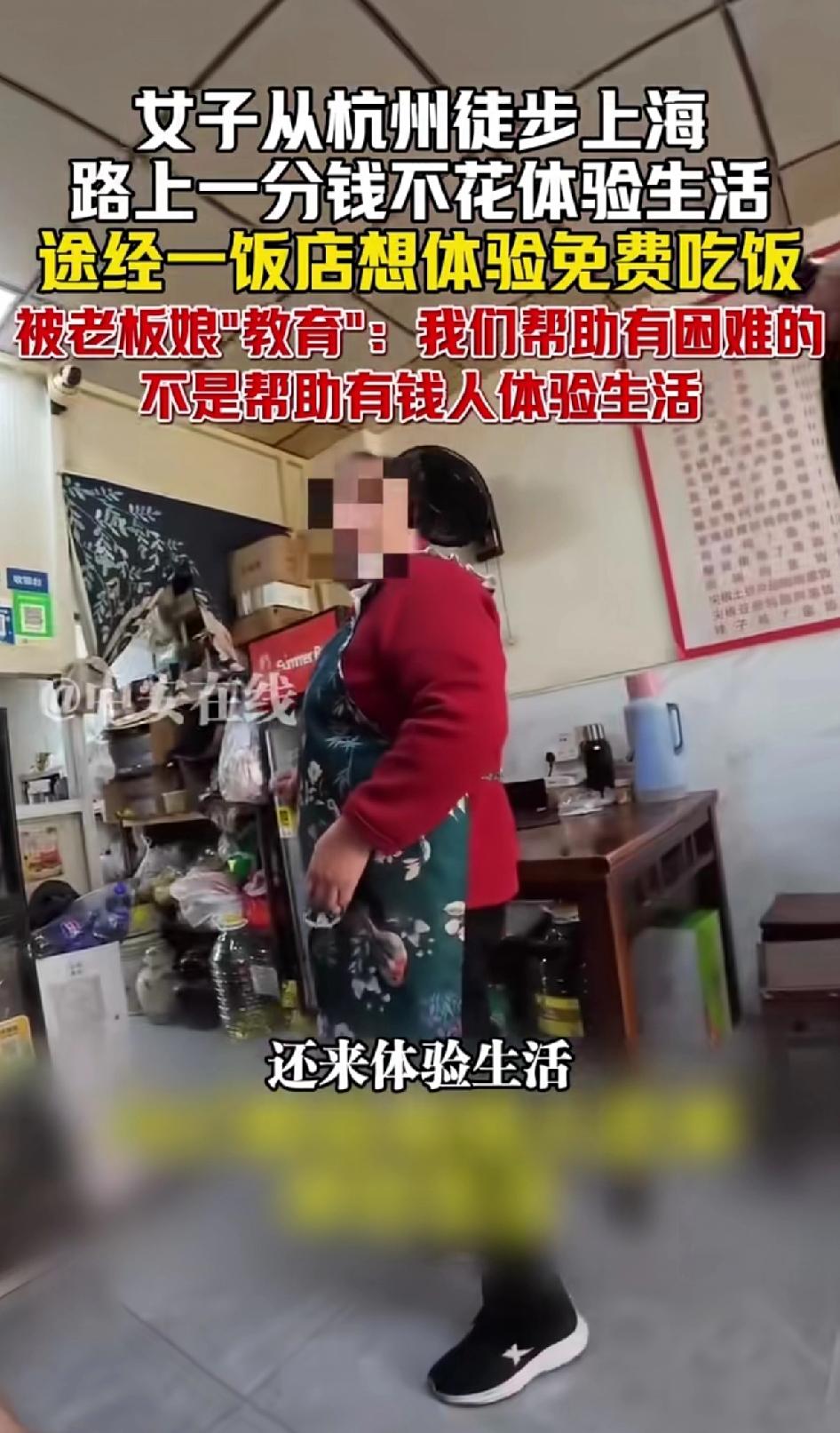 女子从杭州徒步到上海,路上一分钱不花体验生活,途经一饭店想体验免费吃饭,被老板娘“教育” 视频里的女子先找路人帮忙,被果断拒绝。之后到饭店想免费吃饭,被老板娘“教育”。老板娘直言,“你们这些有钱人还来体验生活,一顿饭钱都舍不得给”,女子解释是体验课。老板娘又说只帮有困难的人。 不少网友力挺老板娘,觉得体验生活不该靠白嫖,像捡垃圾卖钱、帮人干活换吃的才合理,爱心应留给更需要的人。 这女子的做法确实有点不妥,体验生活也得有底线呀。 没苦硬吃,想体验生活没问题,不能让别人破费呀。要不然这种体验有什么意义呀?难道就是白嫖白蹭吗?