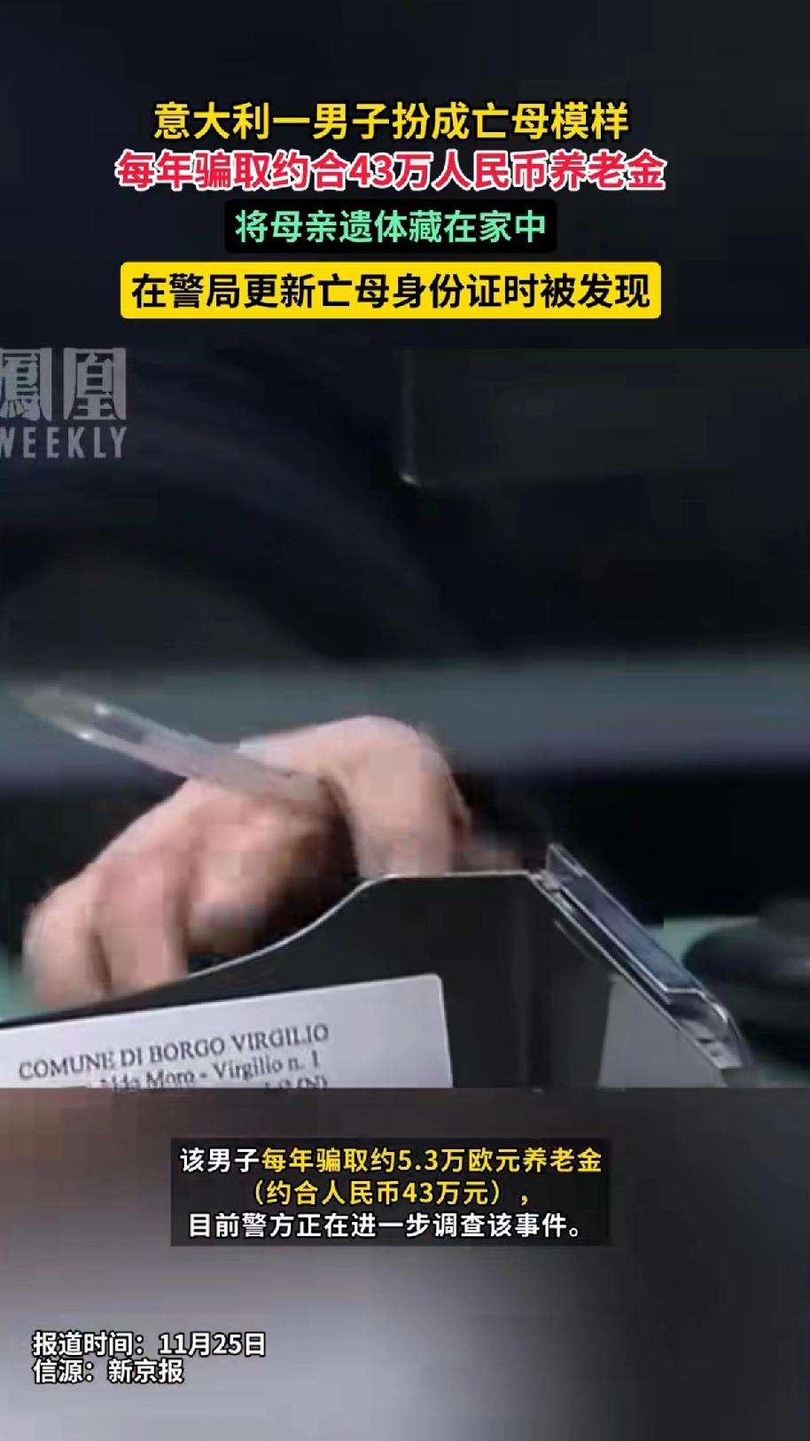 意大利一名男子扮成亡母模样,每年骗取5.3万欧元养老金,约合 43万元人民币。 56岁的失业男护士洛伦佐,母亲三年前去世后,他为了每年约5.3万欧元(约43万人民币)的养老金,把母亲遗体藏家,自己扮成母亲模样。 他每年精心“表演”,做老式卷发、化妆,穿母亲旧衣,模仿签名填申报表,取款时也乔装打扮。 但他非要办新身份证,工作人员发现“老太太”脖子粗、有喉结报了警,警方还发现遗体已成木乃伊。 为了钱也不让母亲入土为安,放了三年都成干尸了吧! 他这么做,一是怕穷,二是怕孤单,还要还母亲生前看病的债。可现在他面临多项罪名,真是一步错满盘皆输。