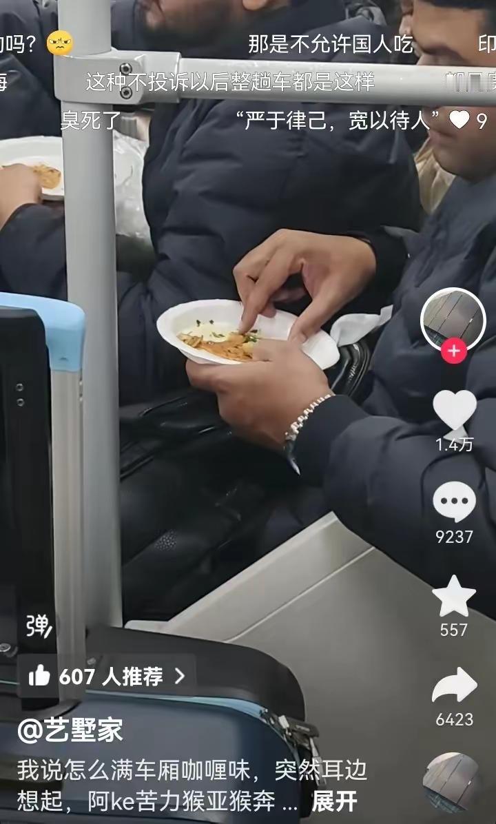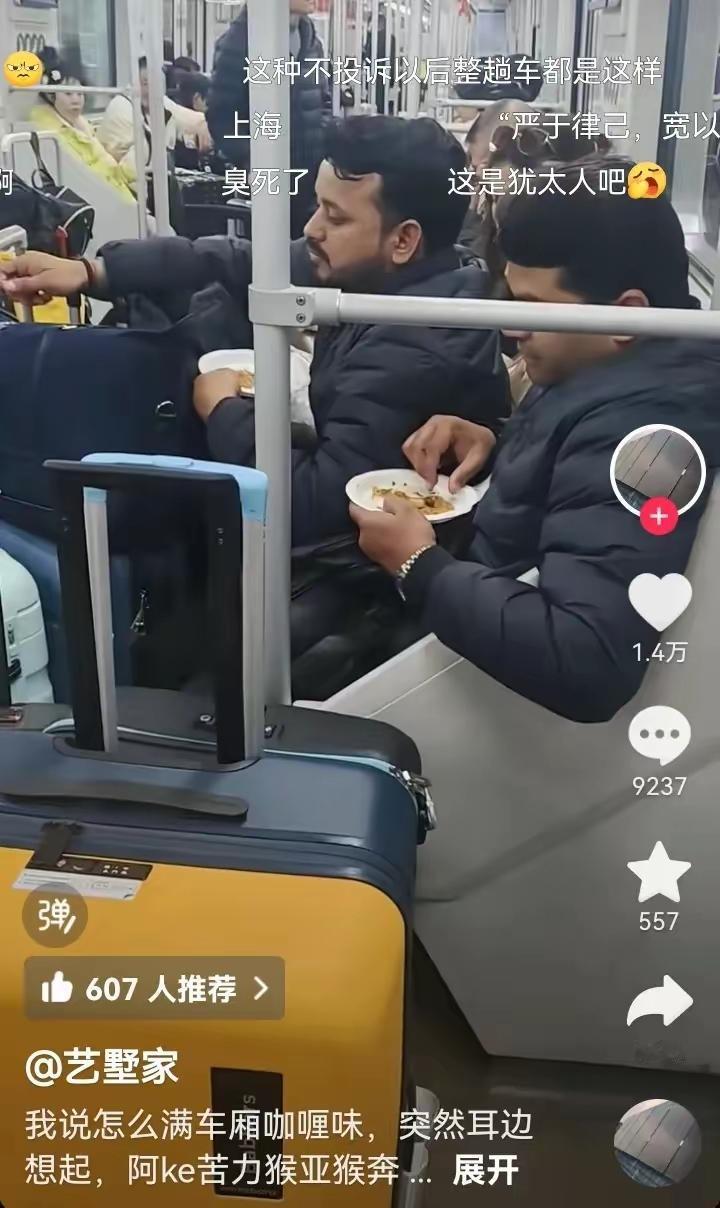 上海地铁这波操作真让人憋火!外籍人士带行李箱在车厢徒手吃咖喱饭,满车厢异味飘着,这哪是 旅游商务,分明是无视公共规则! 别拿文化差异当借口,《上海市轨道交通乘客守则》早明确禁止车厢饮食,这规则对国人外籍一视同仁,没有例外。 尊重是相互的,来做客就得守主人家的规矩,公共空间的舒适不该被特殊对待打破。 更让人不是滋味的是车厢里的沉默,其实不用硬碰硬,联系工作人员或打客服反馈就能制止。 文明不是忍出来的,维护公共秩序,每个乘客都有话语权。 遇到这种明显违规的不文明行为,你会选择默默忍受还是主动反馈?