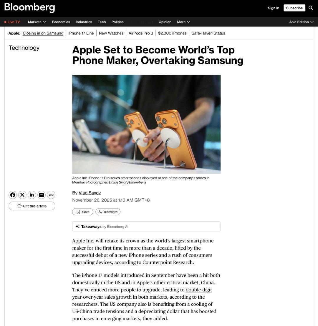 两条苹果要完的消息:● 感谢 Google Gemini,苹果的市值已经来到了 4.09 万亿(Nvidia 是 4.32 万亿)。● 感谢 iPhone 17 系列,苹果即将超越三星成为手机第一大厂。(彭博社说的,不是我说的)