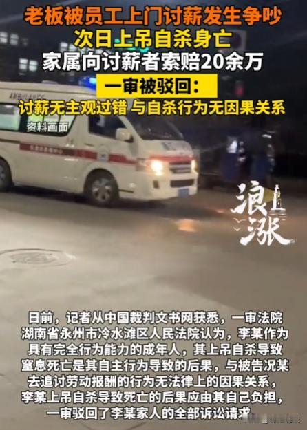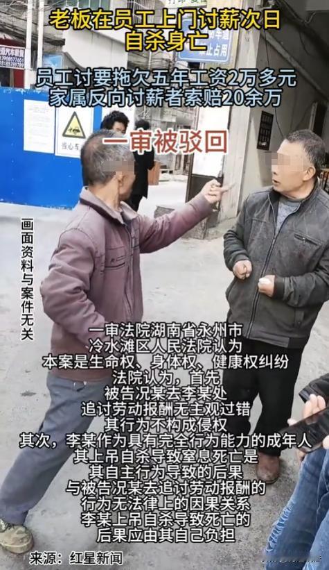 湖南永州,李某曾与人共同经营企业,况某在企业任职,企业拖欠况某2万多工资后,况某到李某家讨要欠薪时双方争吵,第二天李某上吊自杀,李某家人把况某告上法院,要求其承担李某死亡20%责任,赔偿20余万元。 (来源:红星新闻、中国裁判文书网) 李某和别人一起经营企业,况某2017年6月到这企业当领队,没签劳动合同。 从2020年开始,企业就拖欠况某2万多工资。 到2025年3月2日,况某去李某家讨要工资,没谈拢还吵了起来,况某还报了警。 这讨薪的事,本来挺常见,可谁能想到后面竟闹出了人命。 民警到现场劝导后,双方情绪好不容易稳定下来,大家以为这事就这么过去了。 可第二天,李某居然上吊自杀了。 李某的家人,觉得这事儿和况某脱不了干系。 他们认为况某讨债时吵嚷,对李某造成了极大伤害,导致李某想不开自杀。 于是,李某家人一纸诉状把况某告上法院,要求况某承担李某死亡20%的责任,赔偿20余万元。 况某也是委屈的很,本该属于自己的工资没有要回来,还摊上这么大的事。 况某觉得李某的自 杀,和自己一点关系都没有,他去讨薪,那是自己的合法权益,企业拖欠工资本来就该要回来。 而且李某之前就有自杀倾向,这怎么能怪到自己头上呢? 双方各执一词,矛盾一下子就尖锐起来。 有人觉得况某讨薪没错,李某自杀是自己的问题,不能让况某背锅。 可也有人觉得,况某讨薪时态度可能太激烈,对李某心理造成了刺激,多少得负点责任。 况某讨薪的行为和李某自杀之间,到底有没有法律上的因果关系,况某该不该承担赔偿责任呢? 从李某家人立场看,他们失去亲人,悲痛的心情可以理解。 他们觉得李某自杀是因为况某讨薪时的争吵,况某的行为和李某死亡有直接联系,所以要求况某赔偿。 可况某觉得自己正常讨薪,没有过错,李某自杀是自身原因,和自己无关。 法律上,这属于生命权纠纷。 侵权责任构成要件有四个:行为人有过错、有违法行为、有损害结果、违法行为和损害结果有因果关系。 这四个要件缺一不可,才能认定侵权成立。 1,过错方面,况某去讨薪,这是维护自己合法权益,没有主观故意去伤害李某,不存在过错。 民法典规定,民事主体合法权益受法律保护,任何组织或者个人不得侵犯。 况某讨薪是正当行使权利,没有过错。 2,违法行为,况某讨薪过程中,虽然和李某发生争吵还报了警,但这些行为没有超出合理限度,没有违反法律规定,不属于违法行为。 民法典里对公民正常维权行为有明确保护,况某行为在法律允许范围内。 3,损害结果,李某自杀死亡,这确实是个严重损害结果。 但关键要看这个结果和况某行为有没有因果关系,李某是成年人,有完全民事行为能力,能对自己的行为负责。 他自杀是自主决定,和况某讨薪没有必然联系。 民法典规定,行为人因过错侵害他人民事权益造成损害的,应当承担侵权责任。 可况某没有过错,行为和损害结果也没因果关系,所以不构成侵权。 有人觉得:况某讨薪时争吵,是不是对李某心理造成了刺激,导致自杀,这算不算因果关系? 这不算,法律上因果关系是直接必然联系。 况某争吵可能让李某情绪激动,但不是导致他自杀直接必然原因。 李某之前有自杀倾向和抑郁史,这才是他自杀内在因素。 所以,况某讨薪和李某的自 杀,没有法律上因果关系。 如果况某讨薪时有过激行为,比如辱骂、殴打李某,导致李某自杀,那会不会承担责任? 要是这样,况某就有过错和违法行为,和李某死亡可能有因果关系,可能要承担侵权责任。 民法典规定,侵害他人造成人身损害的,应当赔偿医疗费、护理费等为治疗和康复支出的合理费用,以及因误工减少的收入。 造成残疾的,还应当赔偿残疾生活辅助具费和残疾赔偿金。 造成死亡的,还应当赔偿丧葬费和死亡赔偿金。 但本案中况某没有这些行为,所以不承担责任。 法院审理认为:况某讨薪没有主观过错,不属于侵权行为。 李某作为成年人,自杀是其自主行为,和况某讨薪没有法律因果关系,死亡后果应由自己承担。 所以,最终一审驳回了李某家人的全部请求。 讨薪要合法合规,用正确方式维护自己权益。 企业也要按时支付工资,不能拖欠。 遇到纠纷要冷静处理,通过法律途径解决,不能冲动行事,要学会用法律保护自己,也要尊重他人的权益。 【信息来源: 老板在员工上门讨薪次日自杀身亡,家属向讨薪者索赔20余万,一审被驳回 2025-11-25 18:56·红星新闻】