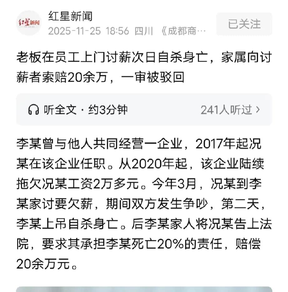 湖南永州,老板欠员工20000块工钱, 5年了都不还,员工按耐不住,上老板家讨工钱,两人因此大吵一架,员工工钱还是没拿到手,谁料,老板想不开,次日竟上吊身亡,家属悲痛欲绝,认为老板的死是员工上门私闯民宅讨薪造成的,告上法庭,向员工索赔21万余元,员工懵了,之后甩出一堆证据,法院判决亮了。 2017年6月份,况某经过应聘来到李某经营的企业上班,担任领班一职。 当年那个企业是李某和另一个合伙人一起经营的,况某工作认真负责,为人也实在、勤快,李某跟合伙人都很信任和喜欢他。 能得到老板的赏识,况某更加努力,他在该企业一待就待到2025年。 不过,从2020年开始,因为企业经营不善,李某就开始陆陆续续拖欠况某的工钱,就是不给他发。 况某念旧情,没有过多催债,所以,这几年就一直这么拖着。 转眼到了2025年,李某欠况某的工钱加起来一共有2万块,可他不但没还,连提都不提。 况某一开始觉得,跟了李某那么多年,大家都是熟人,所以,从侧面去提醒李某,可李某就是找理由推脱。 至于况某为什么没有催另一个合伙人,新闻里没有提到,也许起初企业是两个人共同经营,后来另一个退出来了,或许是应该李某给况某发工资,道他没发。 总之,工钱的事,况某只认准跟李某拿,可李某死活不肯结。 况某开始着急了,他心里想着,这几年赚钱那么难,2万块钱对他来说不是小数目,不能就这么平白无故给抹掉。 为了要回自己的血汗钱,况某按耐不住在2025年3月2号那天,亲自跑到李某家,向他讨工钱。 谁料,李某非但不给况某结工钱,还跟况某吵了起来,两人因为这两万,最终闹得不欢而散,而况某依然要不回一分钱。 况某本想着等过段时间,再继续催,直到全部要回自己的血汗钱。 没想到,次日,况某收到消息,李某竟然在家上吊身亡。 这个消息让况某震惊不已,虽然他的钱没拿回来,但是一条活生生的生命就这样没了,他还是觉得很惋惜。 可没等他缓过神来,不久后,况某竟收到法院传票,说李某家属把他给告了,理由是因为他私闯民宅讨薪,让李某一直想不开,才干傻事身亡。 李某家属称,况某跑到人家家里大吵大闹,把李某的名声给毁了,人格也受了侮辱。 而且李某去世,主要就是因为况某这不当行为导致的,所以他必须承担赔偿责任。他们要求法院判况某承担20%的责任,赔偿214422.8元损失。 况某懵了,自己的工钱一分没收回来也就算了,还无端惹上官司,真是太冤了。 为了证明李某的死跟自己无关,况某翻找出他和李某的电话录音,录音里能证明李某之前就有自sha的想法。 他的病历、住院出院记录还有检查报告都显示,他脑梗手术后长期抑 郁。 而且李某是成年人,自己选择上 吊自sha,这是他自己的决定,和况某没有直接关系。 法院经过调查发现,况某2017年到李某公司当领队,双方并没有签合同,2020年起公司欠了况某2万多工资。 2025年3月况某去讨债没谈拢,和李某吵了架还报了警,民警劝和后双方自己协商了,结果次日,李某上吊自sha了。 一审法院审理后觉得,况某讨薪没过错,不算侵权;李某是成年人,想不开身亡是自己的决定,和况某讨薪没啥法律关系,后果得自己担。 最终,法院驳回李某家属的诉讼请求。 我想说,讨薪本是捍卫劳动权益的正当之举,况某五年追讨两万血汗钱,隐忍多年后登门协商,全程无过激侵权行为,于情于理都站得住脚。 李某的离世令人惋惜,但悲剧根源在于其自身长期抑郁的健康状况与自主选择,将责任归咎于讨薪者,既不合情理,也违背公平。 劳动者的合法报酬不容长期拖欠,讨薪维权本就不易,若正当维权还要担责,只会寒了劳动者的心。 那么,李某死亡跟况某有没有关系,法律如何分析?    《民法典》第1174条规定,损害是因受害人故意造成的,行为人不承担责任。 况某登门讨薪是正当维权,虽与李某争吵但无过激侵权行为,且民警已到场劝和。 况某提交的录音、病历等证据,能证明李某术前脑梗且长期抑郁,此前就有自sha想法。 李某作为完全民事行为能力人,上吊是其自主故意选择,该损害结果由其自身故意造成,与况某讨薪行为无法律上的因果关系,故况某无需担责。 《民法典》继承编相关规定及《劳动法》第50条明确,工资不得无故拖欠,而李某拖欠的工资属于合法债权,可从其遗产中优先受偿。 李某虽死亡,但只要其留有遗产,况某就可主张债权。若李某有继承人,继承人需在继承遗产的范围内承担支付工资的义务。 即便遗产无人继承,况某也可通过劳动仲裁或诉讼,要求从李某遗产中划扣2万元工钱以实现自身权益。    本案中,法院的判决既守住了法律底线,也彰显了公平正义,欠薪者需及时履约,维权者可依法主张权利,这才是社会该倡导的正向导向。 愿每一份劳动都被尊重,每一笔报酬都能按时兑现,让维权者无需惶惶,让守信者行稳致远。 @猫眼学法
