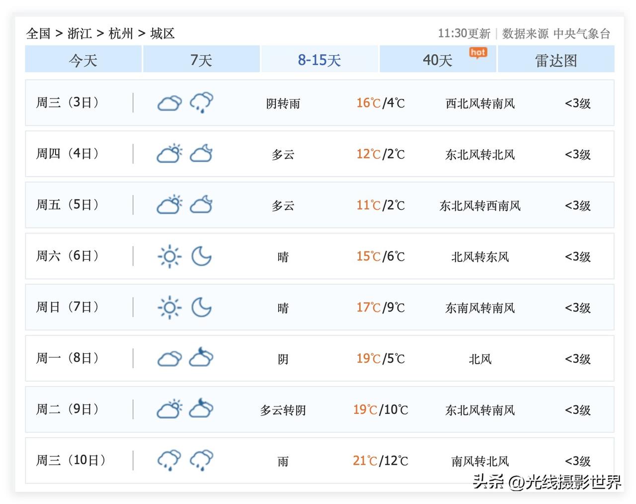 哎!我好难啊!11月26日到12月2日,浙江省杭州市,天气非常好,但是,秋色却并不怎么样啊!可是,12月3日到10日,杭州市,天气总体不好啊!等到12月11日以后,杭州市即便有连续7天的晴天,但是……到时候,秋色究竟会如何呢?! 毕竟我是外地人……我去杭州,最好是期盼在秋色最美的时候,能够有持续5天以上的晴天好天气啊! 看来,要想欣赏到最好的风景……最好是秋天在杭州住15天左右…… 哎!外地游客,确实不容易啊! 生活在杭州的人,尤其是生活在杭州的摄影发烧友,真的太令人羡慕了啊!
