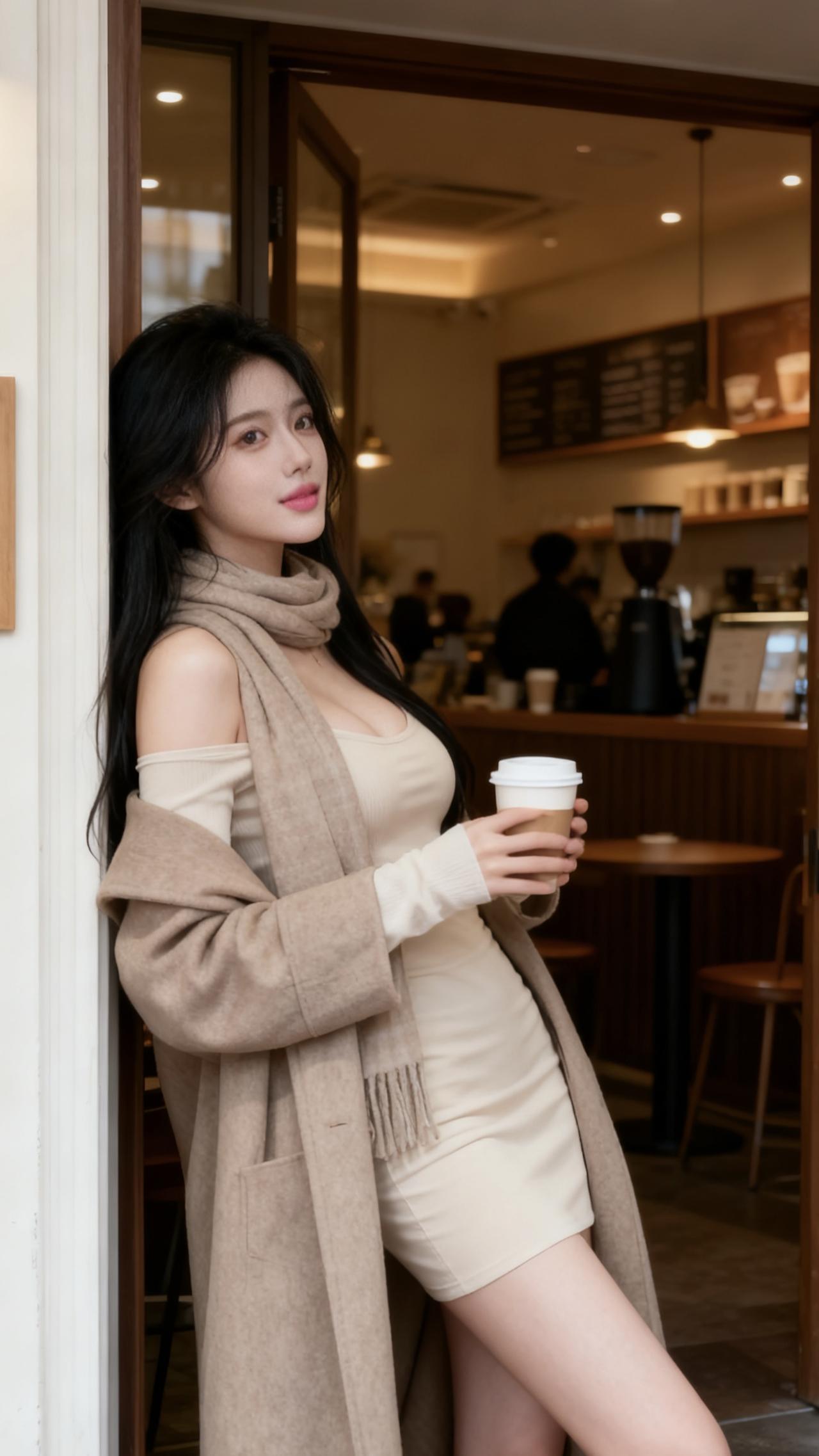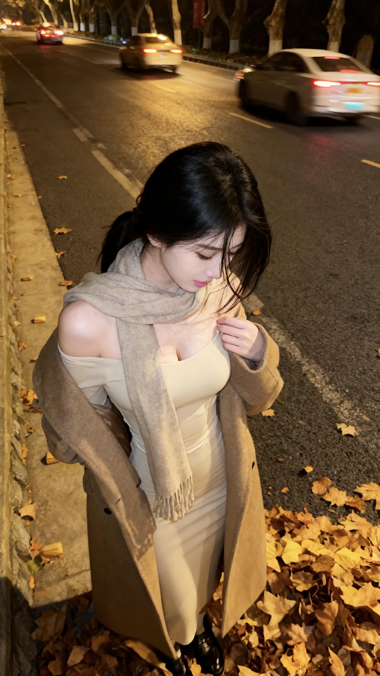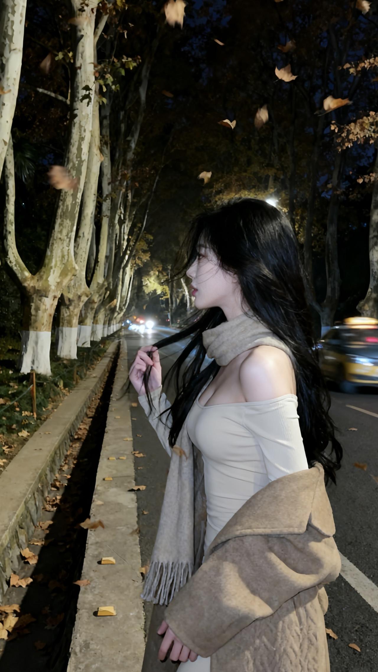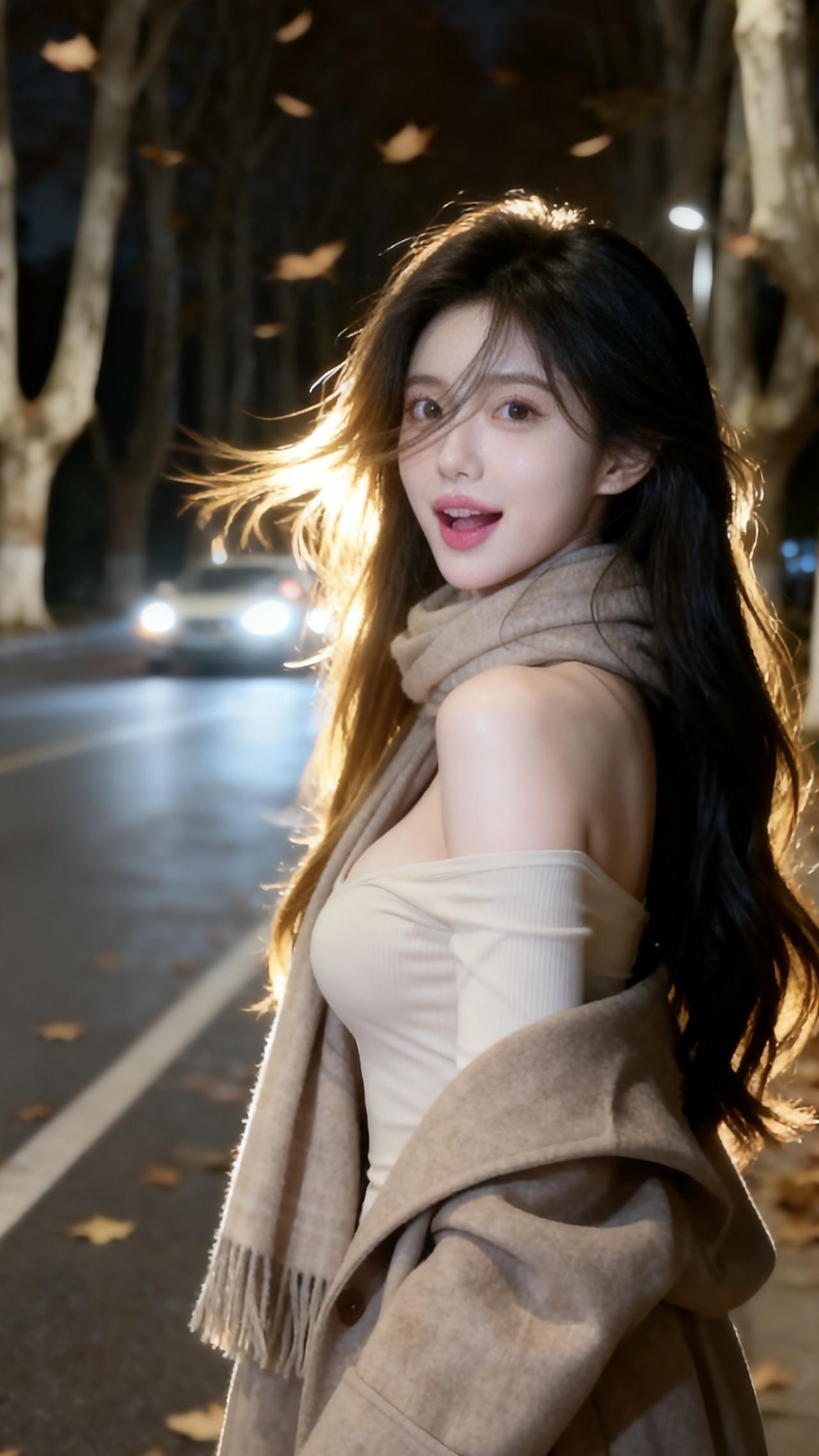夜晚街头的温柔少女,秋叶飘落,暖光倾洒。高清美女