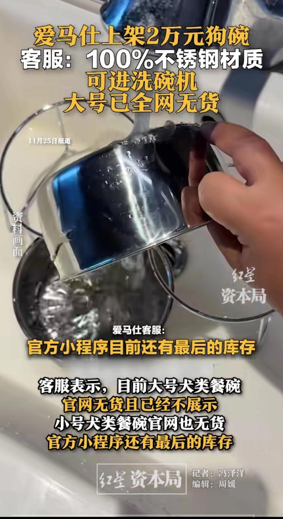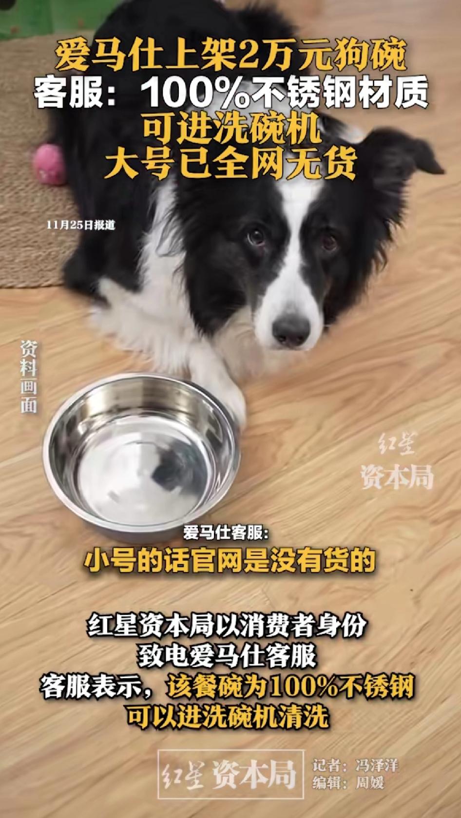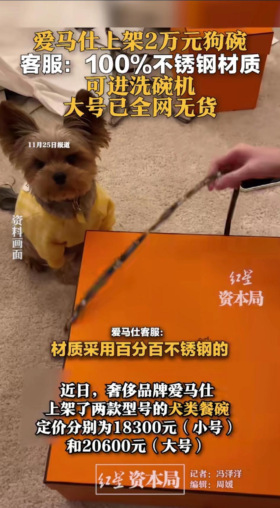 爱马仕上架2万元狗碗,客服:100%不锈钢的,可以进洗碗机,大号一全网无货。 爱马仕又整活了,这次上架两款不锈钢狗碗,小号18300元,大号20600元。这价格,都够普通人几个月工资了。 材质是100%不锈钢,产地法国,有独特图案嵌饰和品牌字样,还能进洗碗机。 客服说这是2026年春季新款,官网和小程序都有,不过大号全网快没货了,官网都下架了。 人家还说明了产地:法国,难道不是义乌出口转内销的吗? 大号都卖断货了,不得不说奢侈品看不上穷人的钱。明白告诉你是不锈钢的。 只是好奇啥样的狗用这款碗?更好奇买这碗的主人,自己吃饭用的什么碗? 爱马仕不是头一回推宠物用品,像45700元的犬用宠物床、25150元的宠物便携包,价格一个比一个离谱。 只能说有钱人的世界咱不懂,这狗碗到底是给狗用,还是给人炫富用呢?