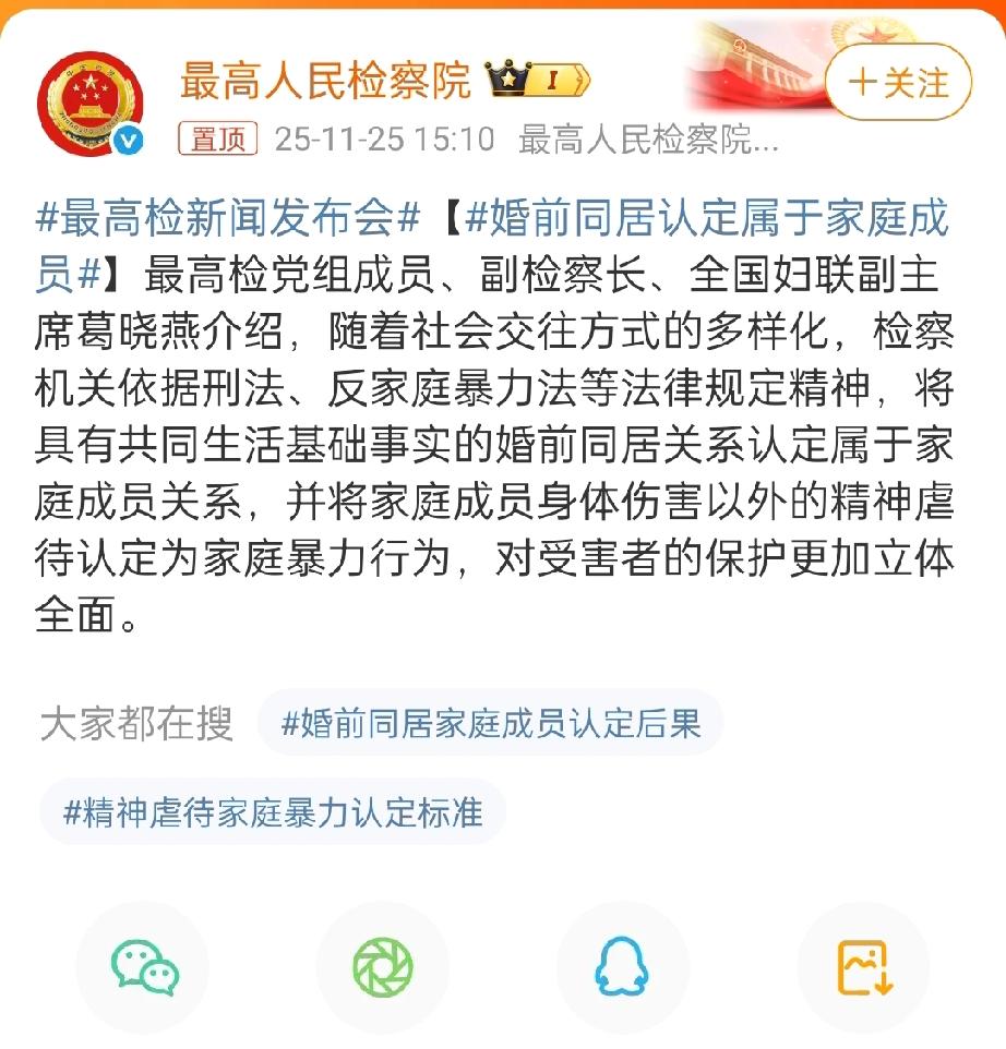 婚前同居认定属于家庭成员。 婚前同居这个概念第一次出现是在包丽案。当时的案情简单说就是包丽自杀,想要追责她男友。可是她男友年龄不够,同居时未满22岁连事实婚姻都套不上。所以最后想出了一个司法上的新概念“婚前同居”。就是假定他们两个大学生同居是为了“未来结婚”,所以他们彼此虽然连领结婚证的年龄都没到,但还是可以算没有血缘和婚姻关系的“家庭成员”,套到虐待罪里判刑。 之后这个概念就成了真正意义上的司法概念,直到今天热搜一位,也算是一个全民科普了。 但是这里面有个难点,怎么样算是“婚前”同居?我国2004年取消“非法同居”的概念以后,就出现了相当数量的丁克不领证的情况。 他们是不愿意结婚,才坚持不领证只同居。同居和结婚最大的区别就是一方可以随时断绝同居关系,也没有夫妻共同财产。 那么现在司法上要怎么认定“婚前同居”呢? 是双方都说为了结婚,才算婚前同居,还是只要一方说,他和对方同居是为了结婚就算“婚前同居”呢? 更或者说像司法实践中,甚至不需要双方肯定。比如包丽案中女方已经死亡,男方要是知道有“婚前同居”这个概念也不会承认他和女方是为了结婚同居,而是司法系统觉得双方“同居是为了结婚”就算“婚前同居”? 这个“婚前同居”的关系认定,肯定还需要更加细化的科普解释。婚前同居 未婚同居困境 婚前同居合法性