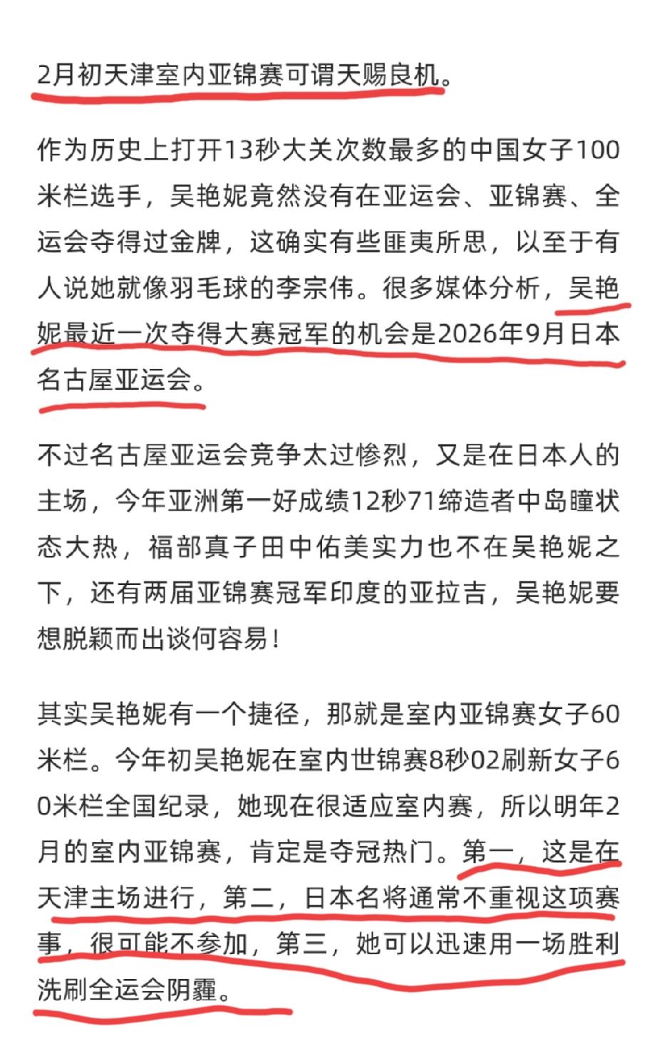 吴艳妮冲击职业生涯第一个亚洲冠军头衔?那这个明年2月在天津举行的室内亚锦赛算不算重大赛事的冠军呢? 据这位专业人士的分析,吴艳妮想在明年9月冲击亚运会冠军基本不可能,因为对手太多、强手太多,加之吴艳妮心理素质这一块也成问题。所以,这位专业人士认为吴艳妮冲击重大赛事冠军的最佳机会是在明年2月举行的天津室内亚锦赛上。因为一是在主场,二是那些高手都不来。 可这算重大赛事的冠军吗?显然不是,再说了,高手缺席的比赛赢了又有何意义?