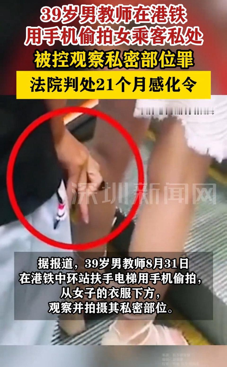 真没想到教书育人的老师,会在港铁里干出偷拍女乘客私密部位的龌龊事!39岁的男教师,本该在讲台上传道授业,却把心思用在了歪门邪道上,在港铁中环站的扶手电梯上,偷偷用手机从女乘客衣服下方拍摄私密部位,还好他的异常行为被发现,最终被送上了法庭。法庭判定他非法拍摄或观察私密部位罪成立,考虑到他坦白认罪,没有判监禁,而是给出了21个月的感化令。可能有人不清楚感化令是什么,其实这是一种让罪犯在社区接受监管和辅导的康复计划,一般适用于社会危害性较小的犯罪,目的是帮违法者改过自新重新回归社会。 但说句实在话,这样的判决真的能让人接受吗?首先,他的身份就很特殊,教师是被社会信任的职业,肩负着教育下一代的责任,本该以身作则遵守法律道德,可他却知法犯法,利用公众对教师的信任干出侵犯他人隐私的事,这种行为比普通人间谍拍更让人寒心。其次,偷拍对受害者的伤害可不小,在拥挤的公共交通里,谁都没想到会被人偷偷拍摄私密部位,这种侵犯带来的心理阴影可能会伴随很久,受害者以后在公共场合可能都会变得小心翼翼,失去安全感。 而且港铁是大家日常出行的公共场所,不是某些人心存歹念的“狩猎场”,每个人都有权利在公共空间里安心活动,不受他人侵犯。之前也有过类似的港铁偷拍案例,有的被判了监禁,可这次这位男教师只拿到了感化令,难免会让人觉得判决太轻。难道坦白认罪就可以抵消对他人的伤害吗?难道教师的身份就能成为减轻处罚的理由吗?我觉得恰恰相反,正因为是教师,更应该从严处罚,才能起到警示作用,让其他有类似想法的人不敢越雷池半步。 很多女性在公共场合都有过被骚扰的顾虑,上扶梯要注意身后,穿裙装要时刻提防,这种小心翼翼的背后,是对侵犯行为的无奈。我们需要的不是事后的轻罚,而是能从根本上遏制这种行为的震慑力。如果偷拍者付出的代价太低,只会让更多人抱有侥幸心理,让公共空间变得不再安全。感化令的初衷是帮人改过,但对于这种侵犯他人隐私的行为,更需要让罪犯付出应有的代价,才能抚慰受害者,也才能维护公共秩序。 这件事真的值得大家好好想想,你觉得21个月的感化令对这位男教师来说判轻了还是判重了?这样的判决能起到警示作用吗?欢迎在评论区说说你的看法。 来源:南方都市报