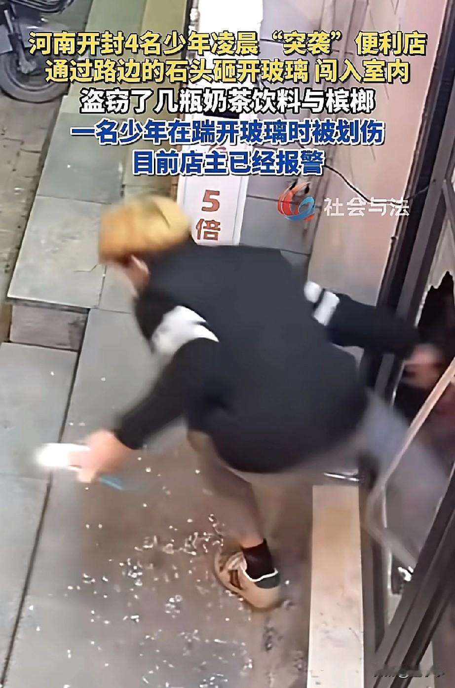 再不管就毁了!近日河南开封,四名青少年凌晨在全部武装下,砸门钻进便利店里面,偷走了数包零食和饮料,虽然损失不大,但老板最后还是报警。 从老板曝光的监控中,这四个人年龄不大,而且他们进去并没有选择贵重的东西,只是拿了一些零食和饮料。 尤其是在凌晨,可想而知他们这几个已经还是在外面玩耍,肚子饿了所以才会做出这样的事情来。 这是不是所谓的精神小伙子? 所以,建议青少年罪行加重,现在孩子们都早熟,确实得惩治一下。 这样的孩子如果放任不管的话,以后恐怕还会做出更过分的事情来。