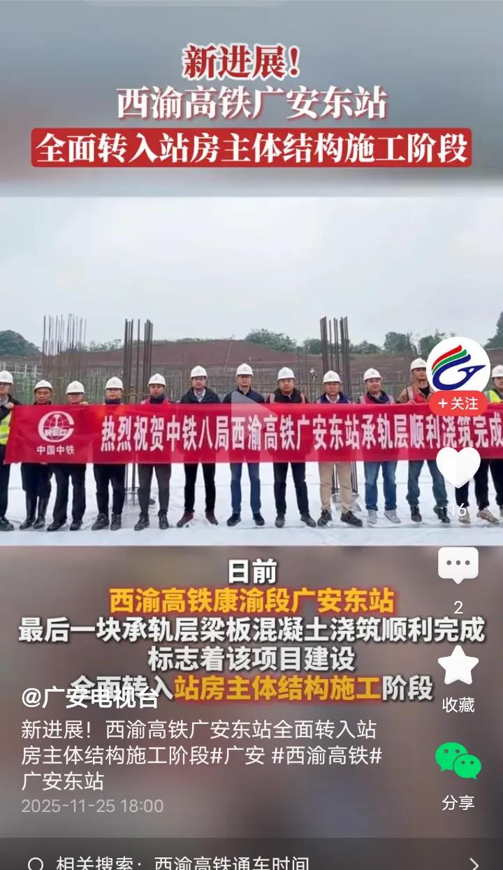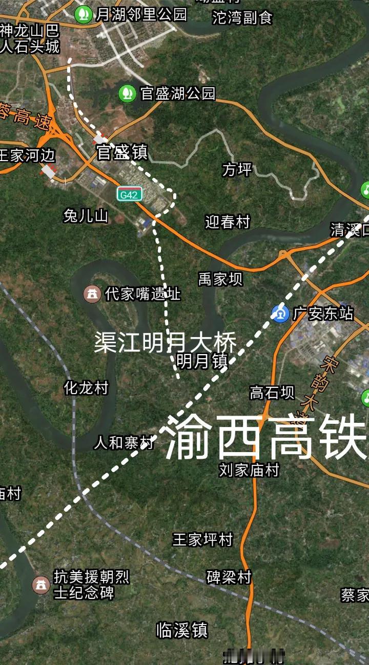 新进展,重庆途经达州至安康时速350公里的渝西高铁全长约10公里的朱家山隧道已经挖进7公里,3台7线的广安东站承轨层已经浇筑完成,站房主体结构即将全面开建,广安东站位于华蓥明月镇东侧,规模为3台7线,站房面积约3万多平方米,未来有望接入南充至广安的客运专线,广安市区来往广安东站除了走G42沪蓉高速和广华大道外未来还可以走方坪大道通过明月渠江大桥来往东站乘坐高铁,2027年底渝西高铁建成后广安坐高铁来往重庆只需20多分钟,来往达州也只要20分钟左右,广安东站段目前架梁已经基本完成,图二为明月渠江大桥近期画面。