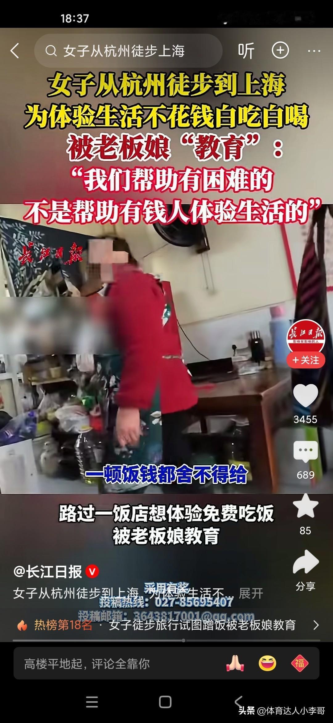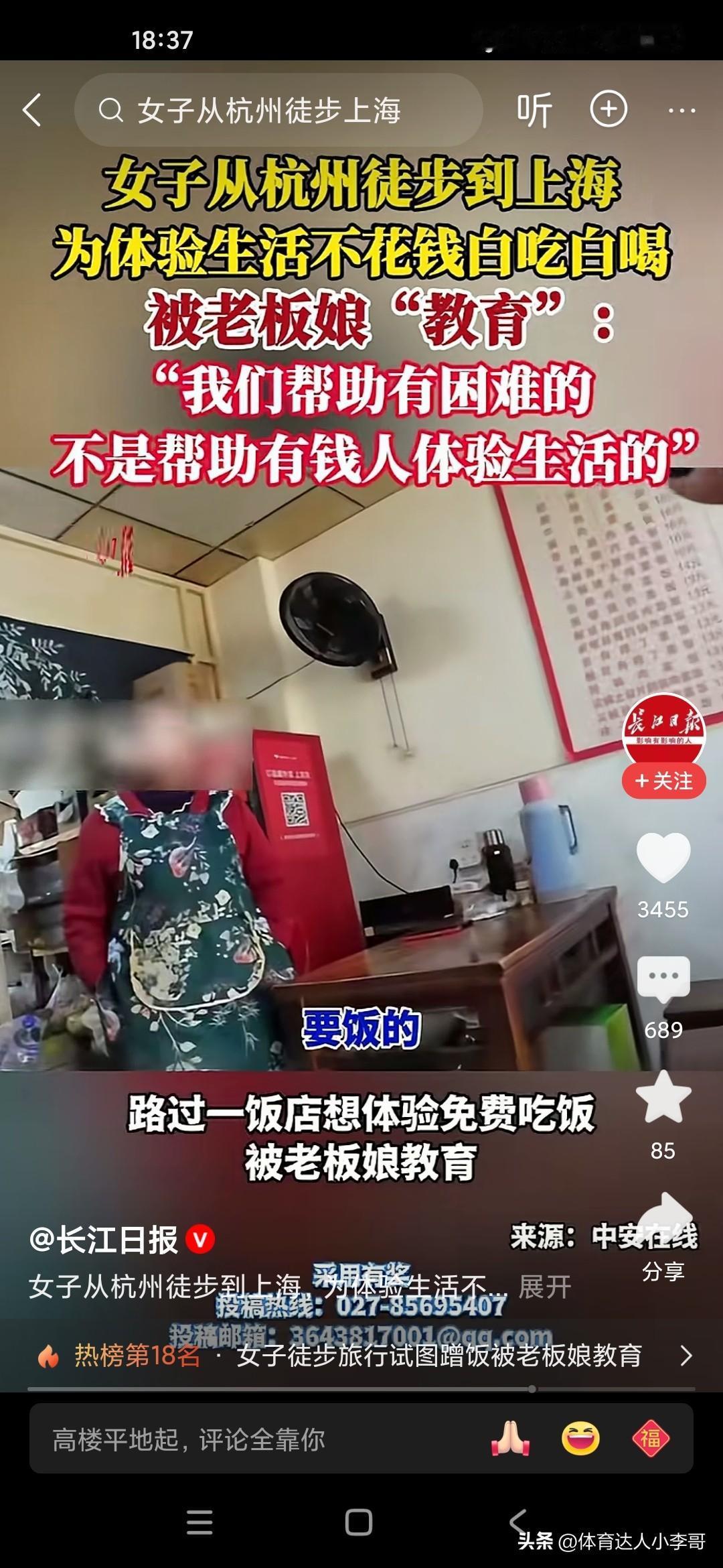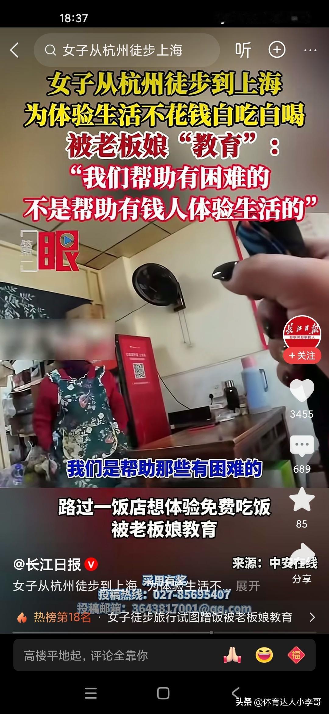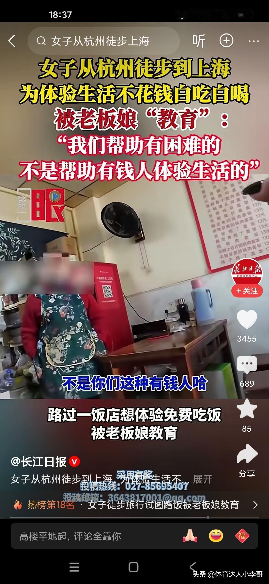 你这是吃饱撑的,你已经这么有钱了,一顿饭的饭钱都不愿意给,我们只是帮助那些真正困难的,只是帮助那些要饭的,或者说是钱包丢了或者说是失业的真的有困难的,撑不下去的人,缺一顿饭的我们可以帮你,对于你们这些有钱人来体验生活的,连一顿饭都不愿意给吗?这个老板娘把这个徒步者怼的哑口无言,她本来是来体验生活的,结果被这个老板娘给上了一课,我觉得她怼的挺好的,有些人是吃饱没事干,非要去体验一下生活,她自己有钱就是不愿意掏,非要体验乞丐的生活,她还不如不说实情呢,完全可以说自己遇到困难了,钱包被偷了,或者说是没有找到工作的,不要穿的那么冠冕堂皇,也许这个老板娘还会管她们一顿饭,提供她一宿住宿,也可能这个餐馆的老板娘遇到这样的事情太多了早就看不惯了,烦啦!
