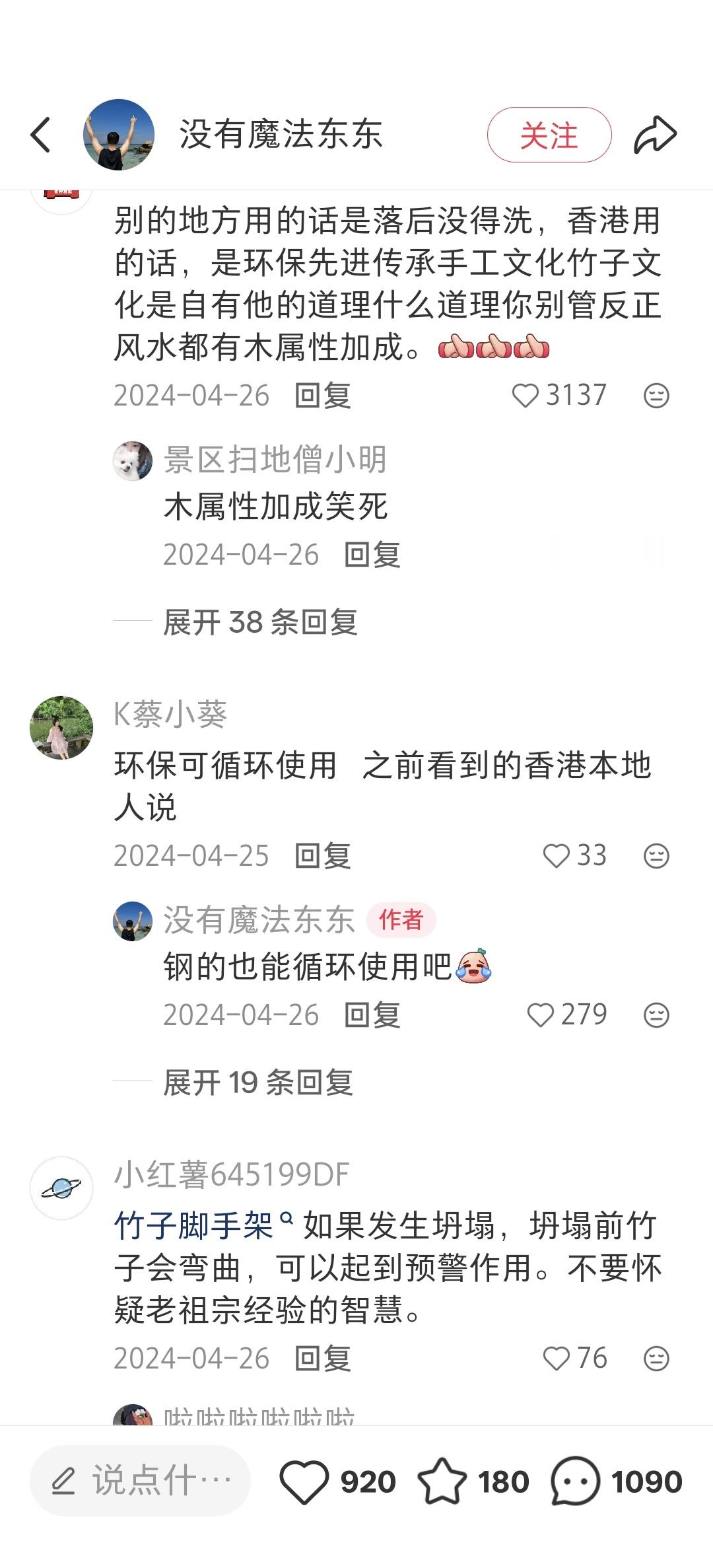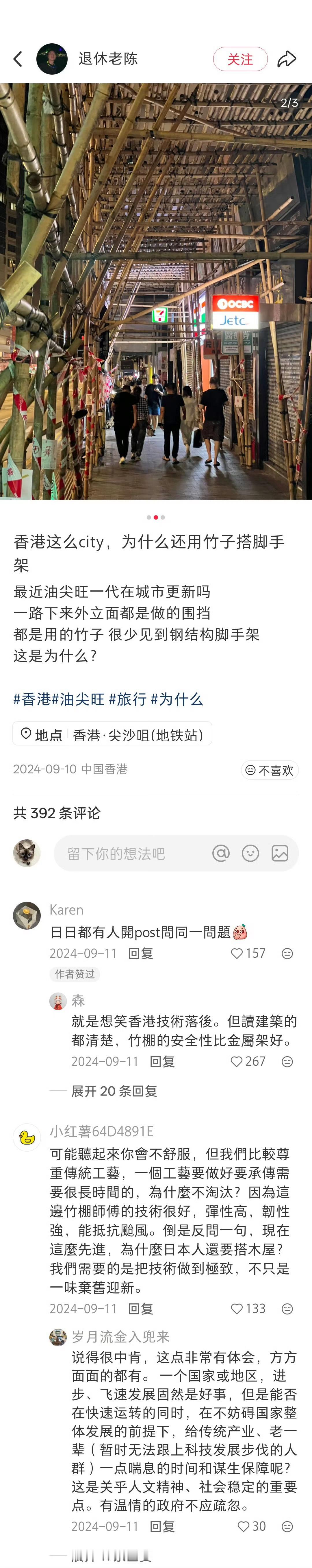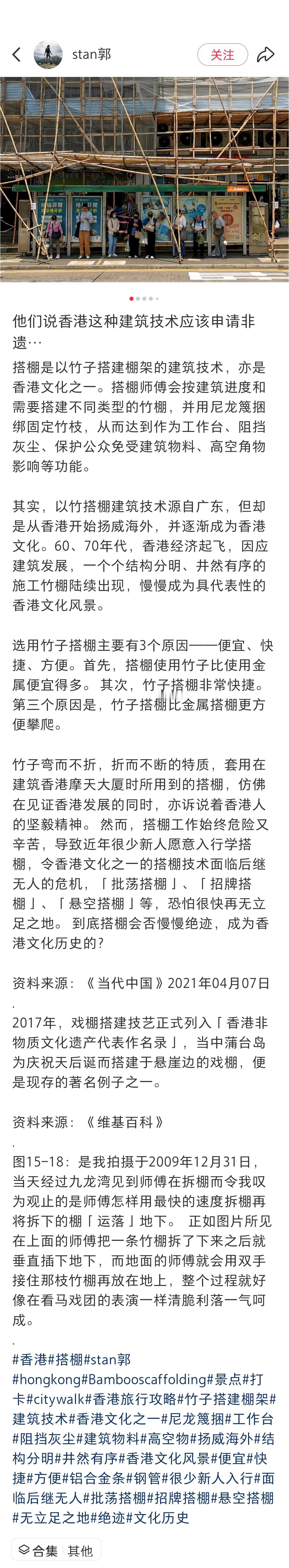 他们说香港这种建筑技术应该申请非遗。搭棚是以竹子搭建棚架的建筑技术,亦是香港文化之一。搭棚师傅会按建筑进度和需要搭建不同类型的竹棚,并用尼龙篾捆绑固定竹枝,从而达到作为工作台、阻挡灰尘、保护公众免受建筑物料、高空角物影响等功能。