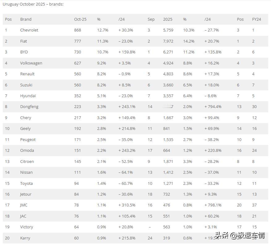 十月,乌拉圭车市,中国品牌销量详情! 大家好,这里是极速车情。今天为大家带来乌拉圭汽车市场10月份的销量数据报告。 十月,乌拉圭车市延续增长态势。雪佛兰超越比亚迪在乌拉圭市场夺冠,比亚迪屈居第三。中国品牌高增长且市占率高达33%,但相比上月35.2%的市占率略有下滑。不过,中国品牌已经彻底改变了乌拉圭市场以往以欧美品牌为主导的市场格局。乌拉圭车市迎来了以中国品牌主导增长的新时代。 2025年10月,乌拉圭汽车销量同比增长6.7%,至6,848辆。 2025年1-10月,乌拉圭累计销量同比增长10.8%至56,006辆。 中国品牌表现 比亚迪:730辆,排名第三,市占率10.7%。 东风:223辆,排名第八,市占率3.3%。 奇瑞:217辆,排名第九,市占率3.2%。奇瑞集团销量:519辆,可排第七,表现优异。 吉利:192辆,排名第十,市占率2.8%。 奇瑞Omoda:151辆,市占率2.2%。 奇瑞捷途:84辆,市占率1.2%。 江铃:78辆,市占率1.1%。 江淮:76辆,市占率1.1%。 奇瑞开瑞:60辆,市占率0.9%。 北汽福田:58辆,市占率0.8%。 长城:56辆,市占率0.8%。 长安:42辆。 东风小康:41辆。 吉利领克:33辆。 北汽:27辆。 长安深蓝:27辆。 广汽:17辆。 东风风行:16辆。 上汽名爵:11辆。 上汽Maxus:10辆。 吉利雷达:9辆。 奇瑞Jaecoo:7辆。 零跑:6辆。 长城哈弗:5辆。